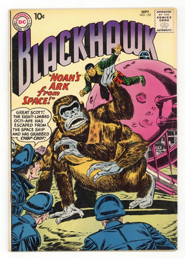 Cover by Dick Dillin & Sheldon Moldoff. Stories by unknown. Art by Dick Dillin, Sheldon Moldoff and Charles Cuidera. Three stories! "Noah's Ark from Space" - An eight-limbed octi-ape escapes from a space ship and grabs Chop-Chop! Also featuring: "The Blackhawk Don Quixote" and "The Machine That Beat the Blackhawks"! Plus: 1-page text story "Bomber's Bluff"! 32 pages, full color. Cover price $0.10.