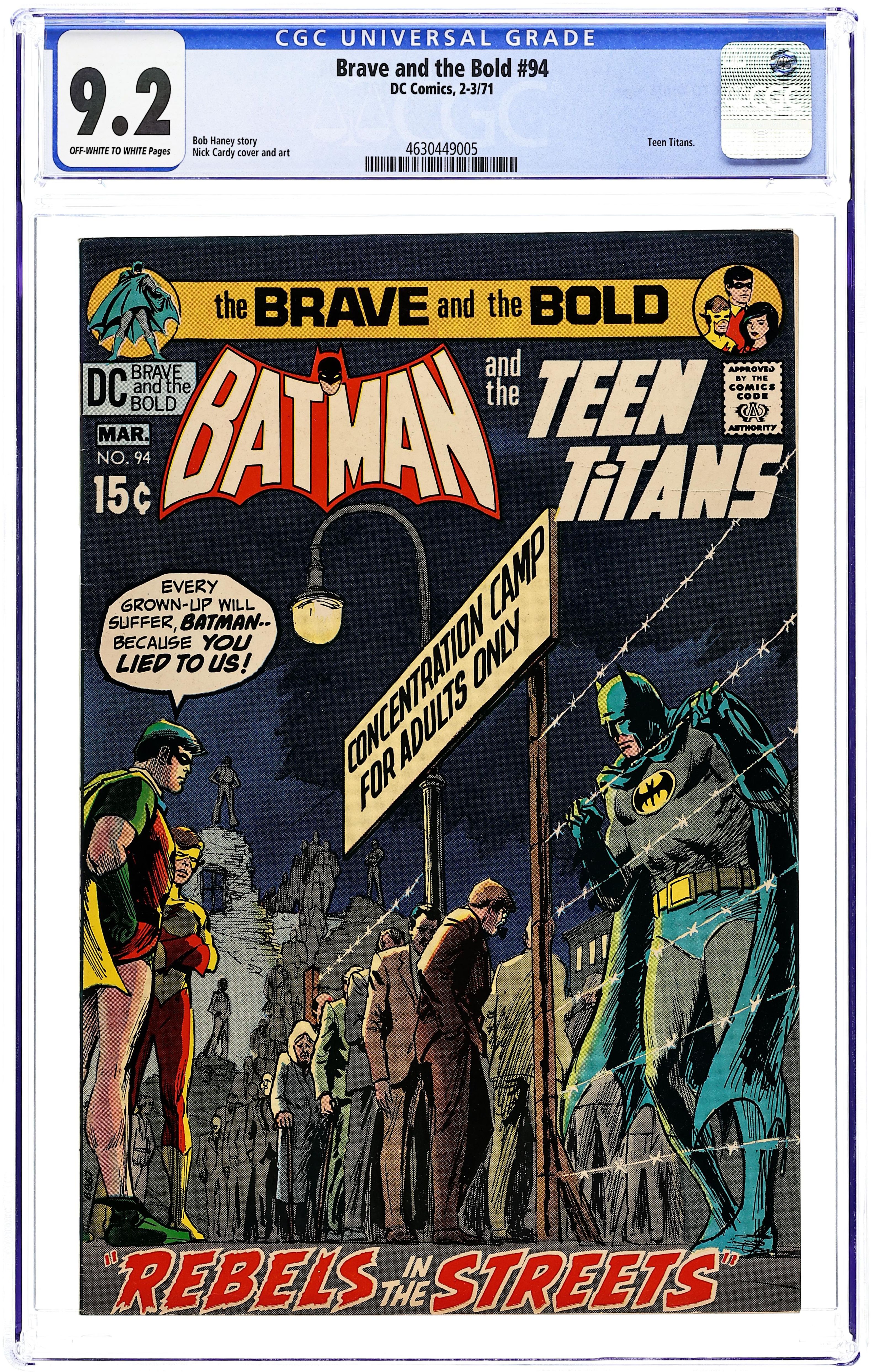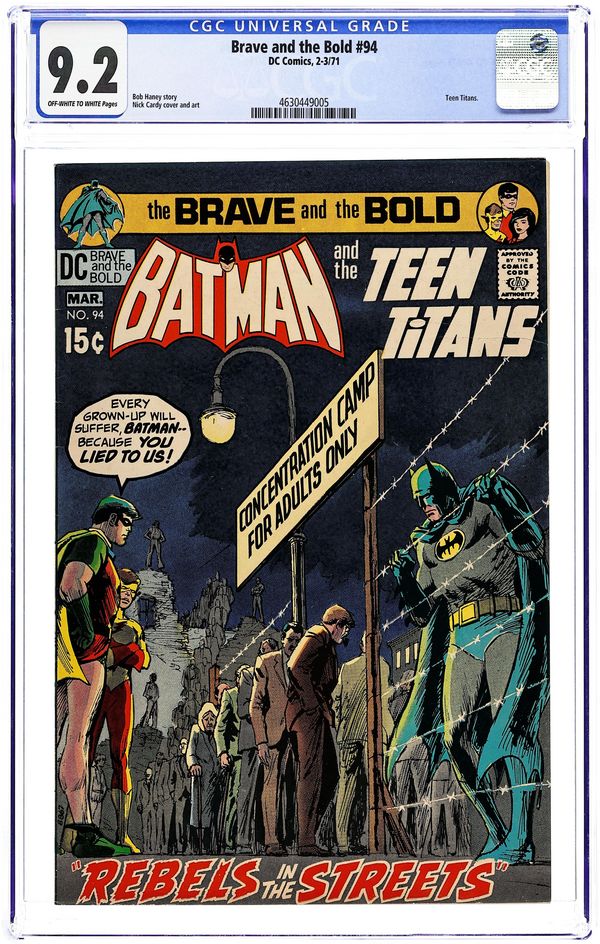 Cover by Nick Cardy. "Rebels in the Streets," script by Bob Haney, art by Nick Cardy; The ghetto's of Gotham City have been barricaded off by a group called Stopp (The Society to Outlaw Parent Power), a group of disenfranchised teenagers who want parents (and adults in whole) to bow to their demands and fix up the ghettos; Using Batman as their mouth piece, the Caped Crusader does everything in his power to try and maintain peace between Stopp and the Gotham police; However, things escalate when Stopp informs Batman that they have a bomb which they plan to use to blow up part of the city; Batman enlists the aid of the Teen Titans to infiltrate the ghetto in order to find the location of that bomb either in their civilian guises or their costumed identities, while Batman and the rest of the city try to keep Stopp from detonating the bombs by allowing themselves to be locked up in the Gotham jail. 36 Pages, Full Color. Cover price $0.15.