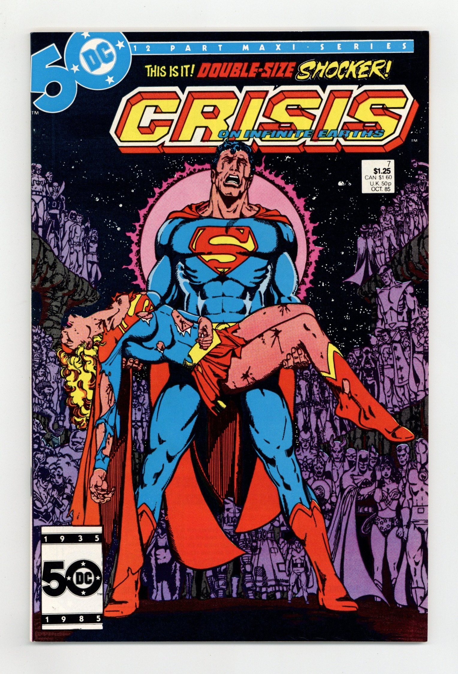 Tags: Crisis on Infinite Earths (part 7)$10.50Direct Edition. "Beyond the Silent Night!" Written by Marv Wolfman. Art by George Perez, Dick Giordano, and Jerry Ordway. At last the origins of the most mysterious players in this story are revealed. Learn the secret pasts of Pariah, and why he is destined to witness world after world die, the tragic past of Harbinger, the mysterious Monitor, and evil incarnate, the Anti-Monitor. Plus, in order to stop the Anti-Monitor from destroying the last remaining Earths in the multiverse, a cadre of the DCU's most powerful heroes mount an all out assault on the villain's stronghold in the dangerous Anti-Matter Universe. It is a task not everyone will survive. Featuring the heroic and tragic death of Supergirl. Cover price $1.25.