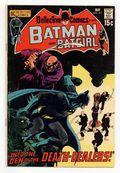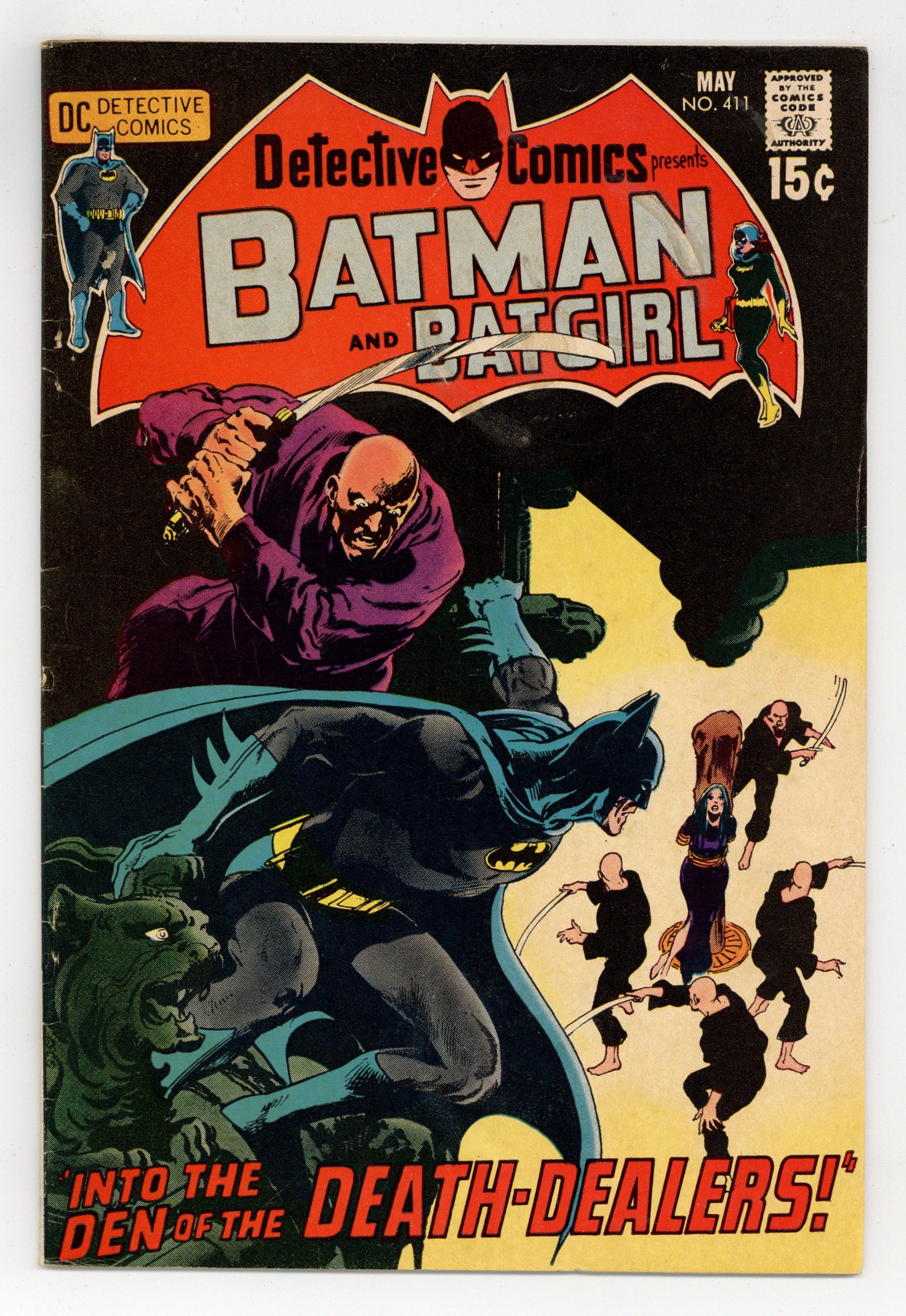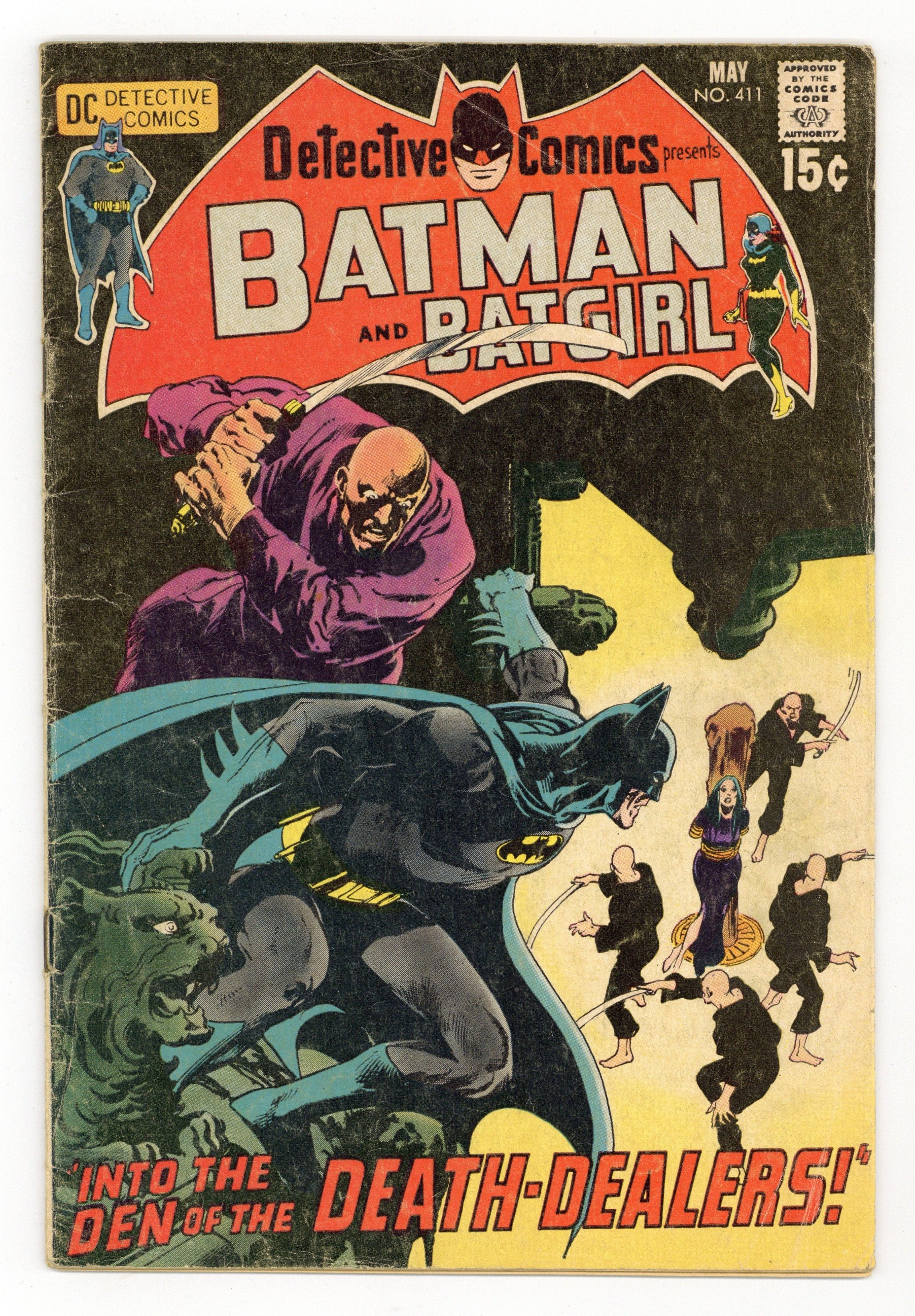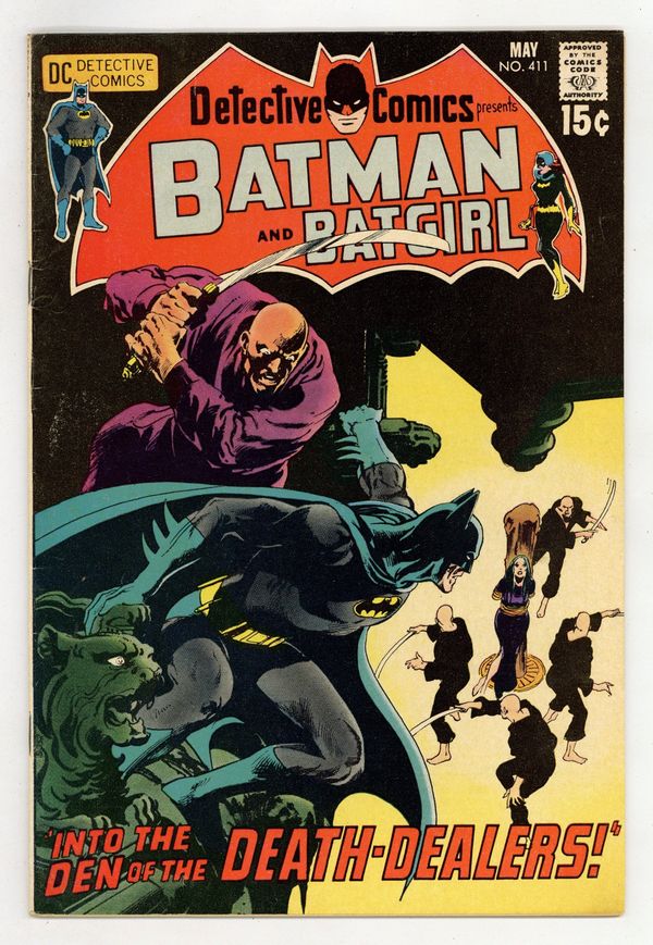 Cover by Neal Adams. Ra's Al Ghul and the first appearance of his daughter, Talia, in "Into the Den of the Death-Dealers!," script by Denny O'Neil, pencils by Bob Brown, inks by Dick Giordano; Batman scales the side of Gotham's Statue of Freedom for a secret meeting with an informant inside the torch; The informant wants police protection in exchange for turning over evidence on Doctor Darrk and the League of Assassins; Before the criminal can reveal anything however, an assassin sneaks into the chamber and stabs him from behind. "Cut... and Run!," script by Frank Robbins, pencils by Don Heck, inks by Dick Giordano; Continuing from last issue, Batgirl has stumbled upon criminal activity involving the latest fashion sensation of the worlds greatest fashion model Mamie Archeson, a discovery that has her strapped onto a fabric cutter by the crook known as Serpy. Letter of comment from letter hack Guy Lillian. 36 pgs., full color. $0.15. Cover price $0.15.