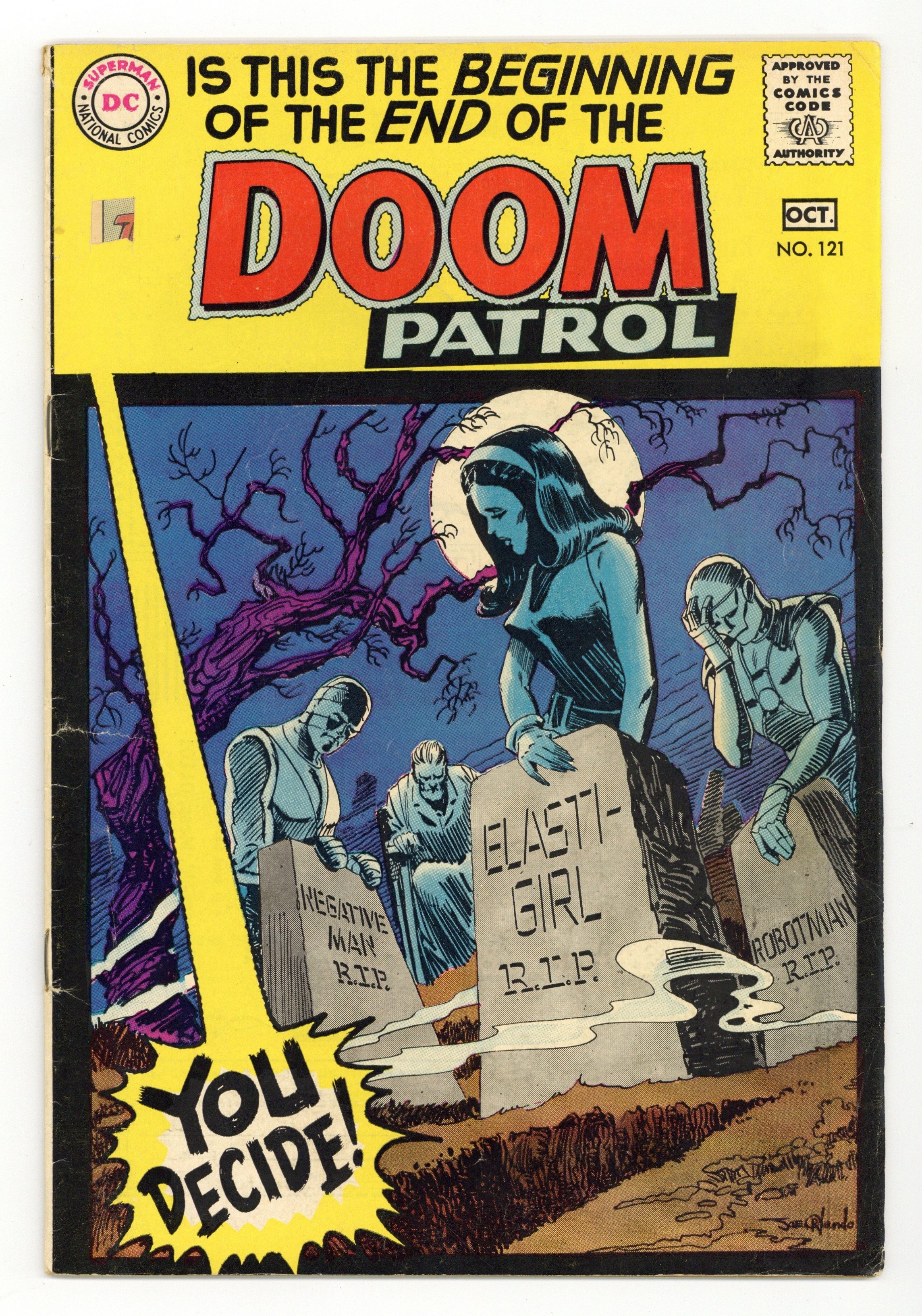 Final issue with new material. Cover by Joe Orlando. The Beginning of the End!, script by Arnold Drake, art by Bruno Premiani; Madame Rouge embarks upon an ambitious plot to avenge herself against the Doom Patrol; First though, she decides to send the Doom Patrol a message by destroying her old colleagues the Brotherhood of Evil; Rouge and her henchmen bomb the lair of the Brain and Monsieur Mallah, seemingly killing them both; She then sends a team of goons to open fire on innocent pedestrians just outside Doom Patrol headquarters; The death of the Doom Patrol. 36 pgs., full color. $0.12. Cover price $0.12.