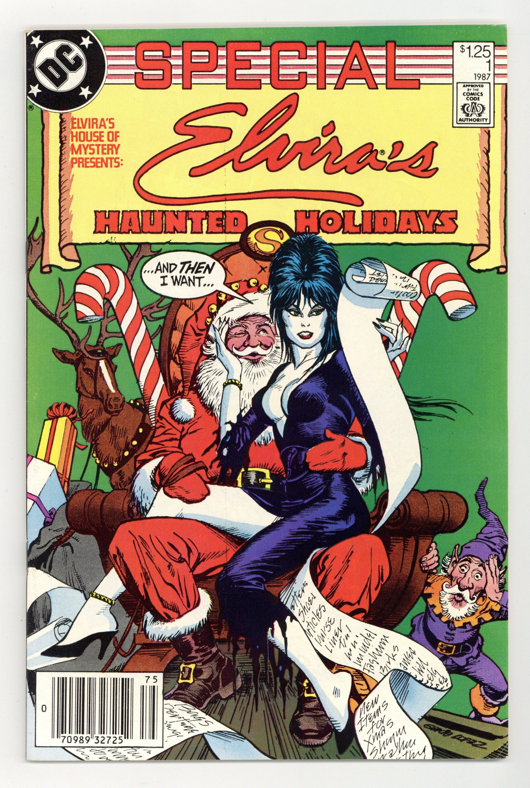 $23.00Elvira's Haunted Holidays. Cover by José Luis García-López. Written by Joey Cavalieri, Michael Fleisher, Barbara Randall and Ed Hannigan. Art by Frank Springer, Jack Sparling, Stephen DeStefano, Craig Boldman and Ed Hannigan. Boo! Did we scare you? No? Well, we'll do a lot better with this holiday treasury of terror, introduced by everybody's favorite hostess of horror, Elvira! Featuring: Elvira, Cain, Abel and Destiny in "Elvira's Christmas Carol" by Joey Cavalieri and Frank Springer; Santa Claus in "Oh, What Fun to Laugh and Sing a Slaying Song Tonight!" by Michael Fleisher and Jack Sparling; "O, Christmas Tree..." by Barbara Randall, Stephen DeStefano and Craig Boldman; and "'Twas the Night before X-Mas..." by Ed Hannigan. Plus: Elvira pin-up by Paul Gulacy. 48 pages, full color. Cover price $1.25.