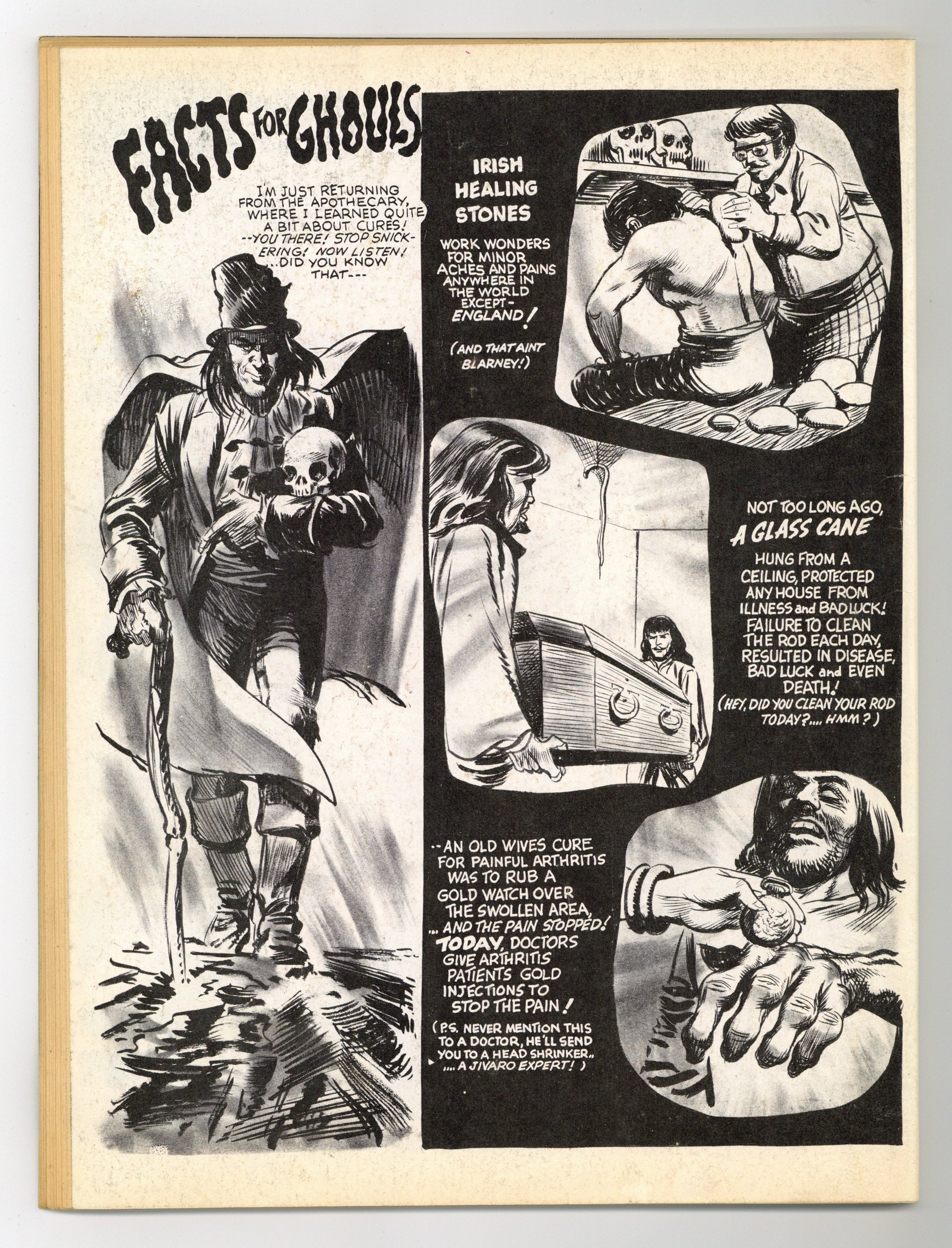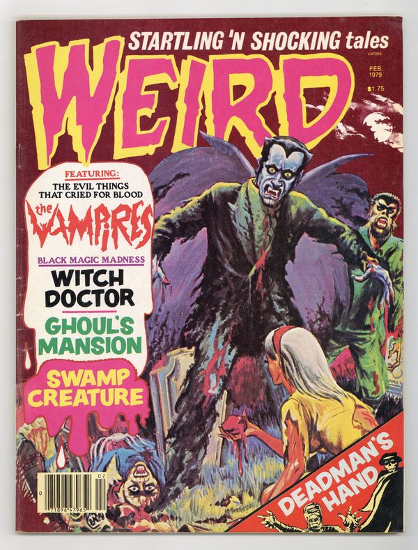 $70.00Cover by Bill Alexander. Stories and art by Dick Ayers, Oscar Fraga, Carl Burgos, Ezra Jackson, Alberto Macagno, Domingo Mandrafina and Chic Stone. The first series from 1960s publisher Eerie presents gory tales of horror and the macabre, many "reanimated" from classic pre-Code horror comics. Oil prospectors in the Amazon run afoul of the beast from Black Swamp. The descendant of famous witch-hunters is called to Ireland by a witch's spell. A sea captain returns to the lighthouse where he stashed a treasure map, only to encounter the partner he's already killed. Lighthouse of Horror; The Witch Doctor; Deadman's Hand; The Vampire Lives; Ghoul's Mansion; Swamp Creature; Witches Revenge; Fangs of Terror; Satan's Stone; When They Meet the Vampire; Twice Dead; Weird Facts; Facts For Ghouls. 8 1/2-in. x 11-in., 64 pages, B&W. Mature readers. Cover price $1.75.