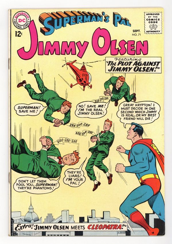 Cover pencils by Curt Swan, inks by George Klein. The Plot Against Olsen!, pencils by Curt Swan, inks by George Klein; Olsen inadvertently spoils one of Mr. Mzyzptlk's pranks, the imp from the fifth dimension gets his revenge by creating three exact duplicates of the cub reporter which cause multiple problems for Jimmy. Jimmy Olsen Meets Cleopatra!, pencils by Curt Swan, inks by George Klein; Jimmy and Professor Potter appear to travel back through time to Ancient Egyptian times. The Nine Lives of Jimmy Olsen!, script by Edmond Hamilton, art by John Forte. 36 Pages, Full Color. Cover price $0.12.