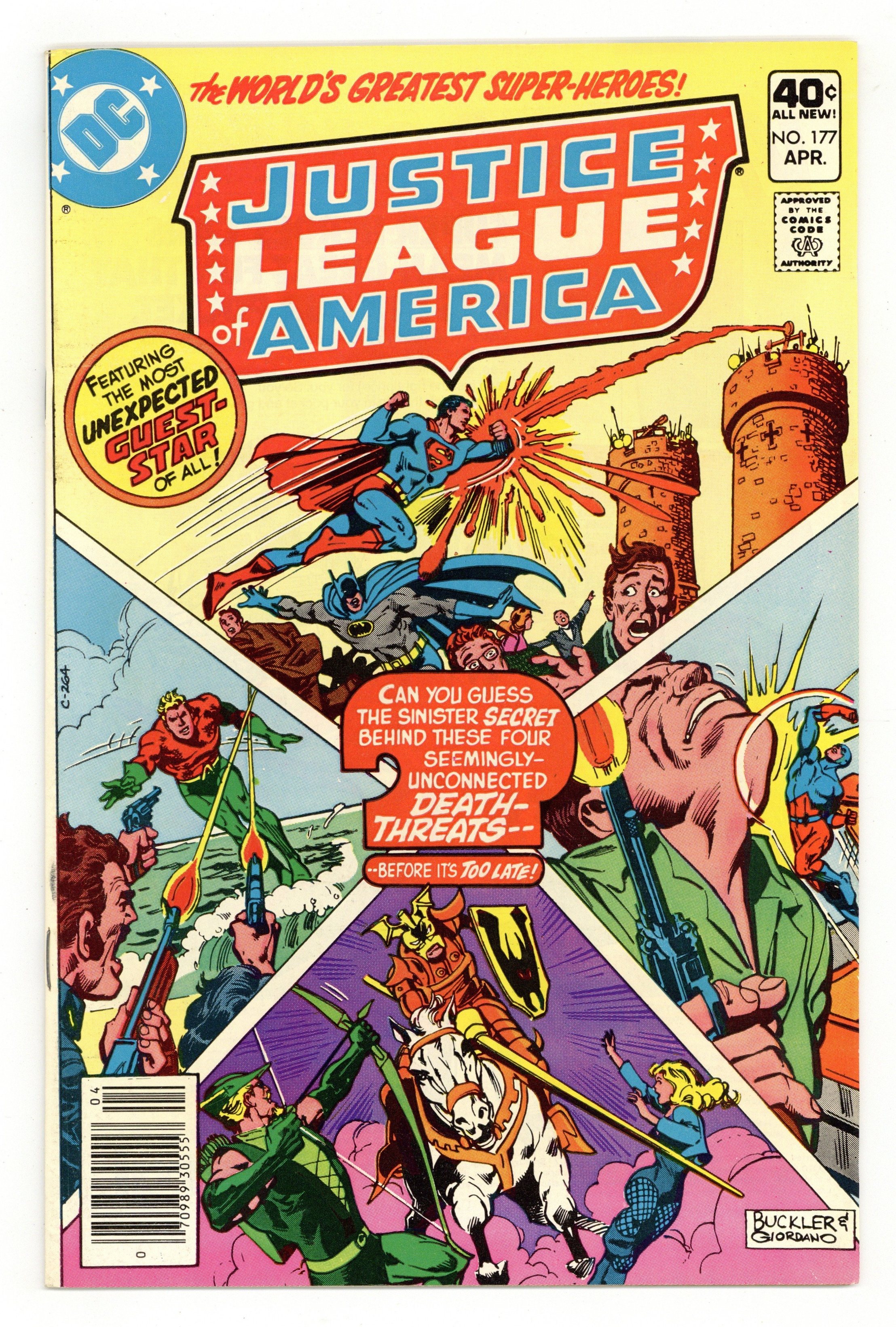 Cover art by Rick Buckler and Dick Giordano for "The Graveyard Gambit!" in which the JLA battle Despero (story continues in #178). Plotted by Len Wein and written by Gerry Conway with art by Dick Dillin and inks by Frank McLaughlin. Features heroes this issue: Superman, Batman, Green Arrow, Aquaman, the Atom, Black Canary, J'onn J'onzz, and Zatanna. Cover price $0.40.