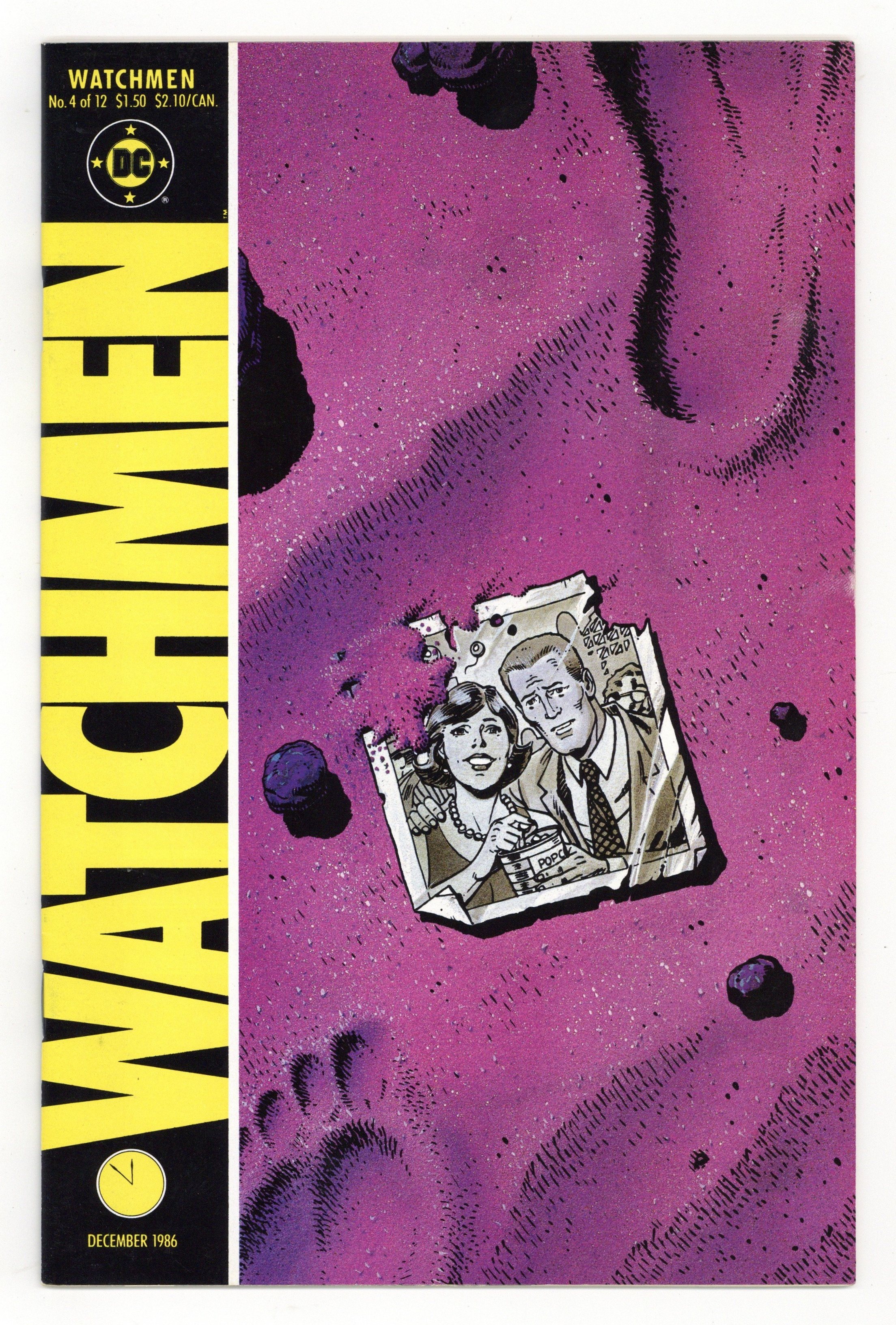 $10.50"Watchmaker". Part 4 of 12. Story by Alan Moore. Art and cover by Dave Gibbons. As Dr. Manhattan wanders across the moon, he looks back on his life. But since he does not experience time linearly, it makes for a very interesting journey. Includes four page fictional text feature presenting the Introduction to the book, "Dr. Manhattan: Super Powers and the Super Powers". 32 pages. Full color. No ads. Cover price $1.50.