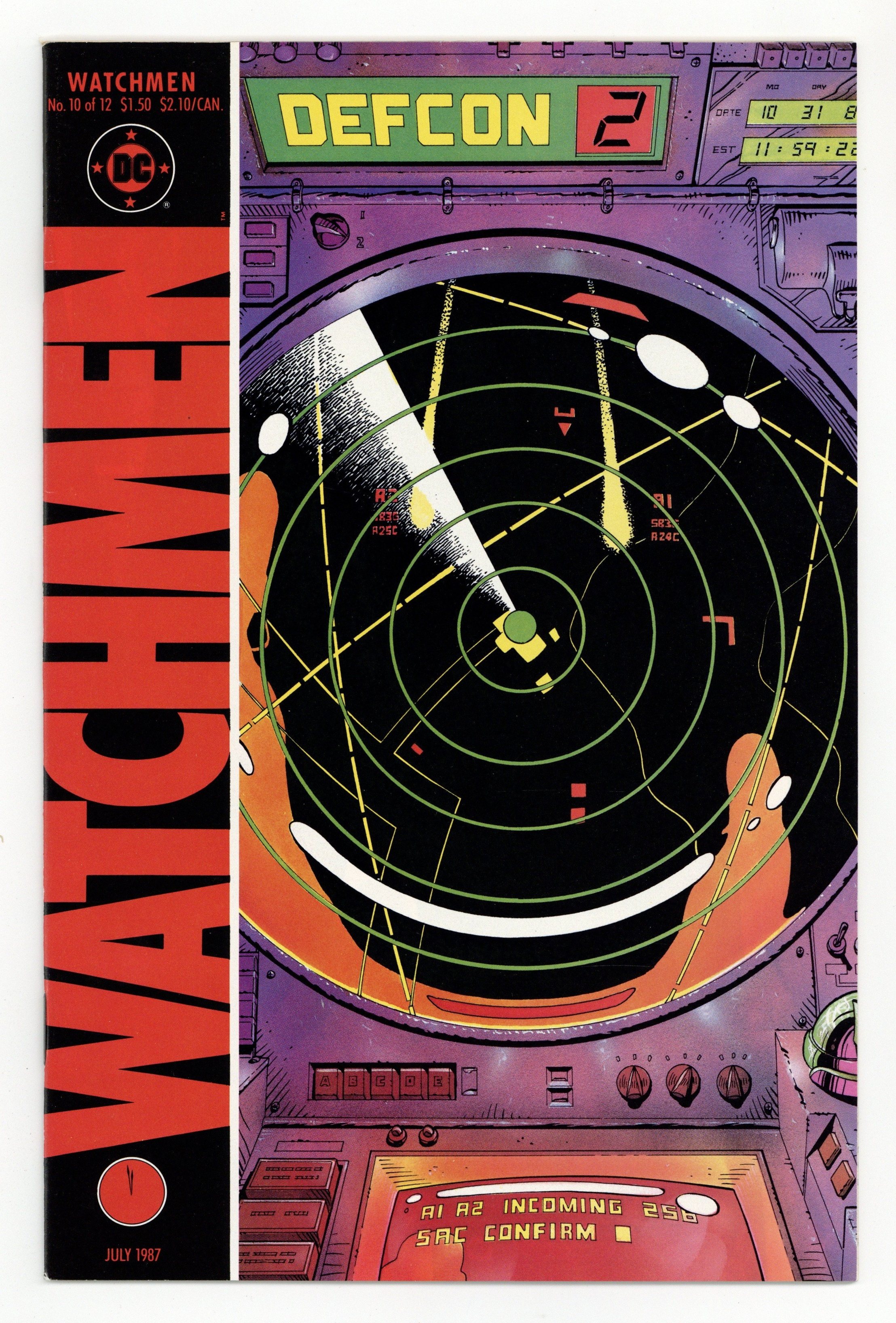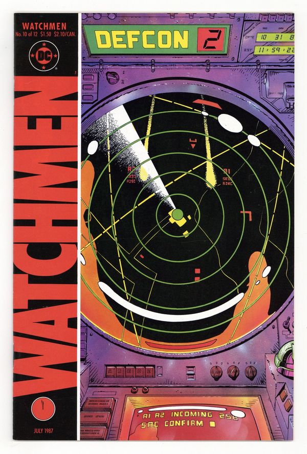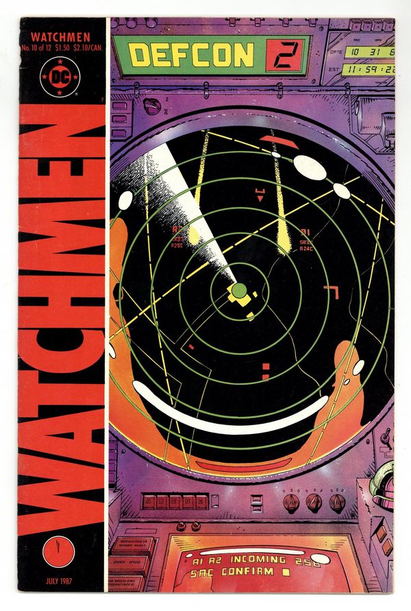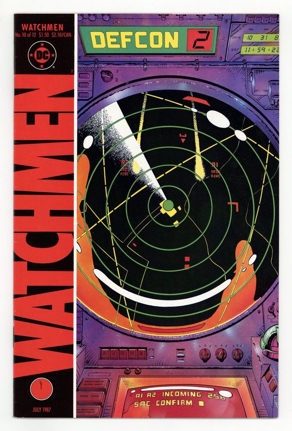 $26.50"Two riders were approaching". Part 10 of 12. Story by Alan Moore. Art and cover by Dave Gibbons. Rorschach and Night Owl continue their detective work and finally discover who is behind the conspiracy. This is not a good thing. Includes four page fictional text feature with a view of Adrian Veidt's scrapbook. 32 pages. Full color. No ads. Cover price $1.50.