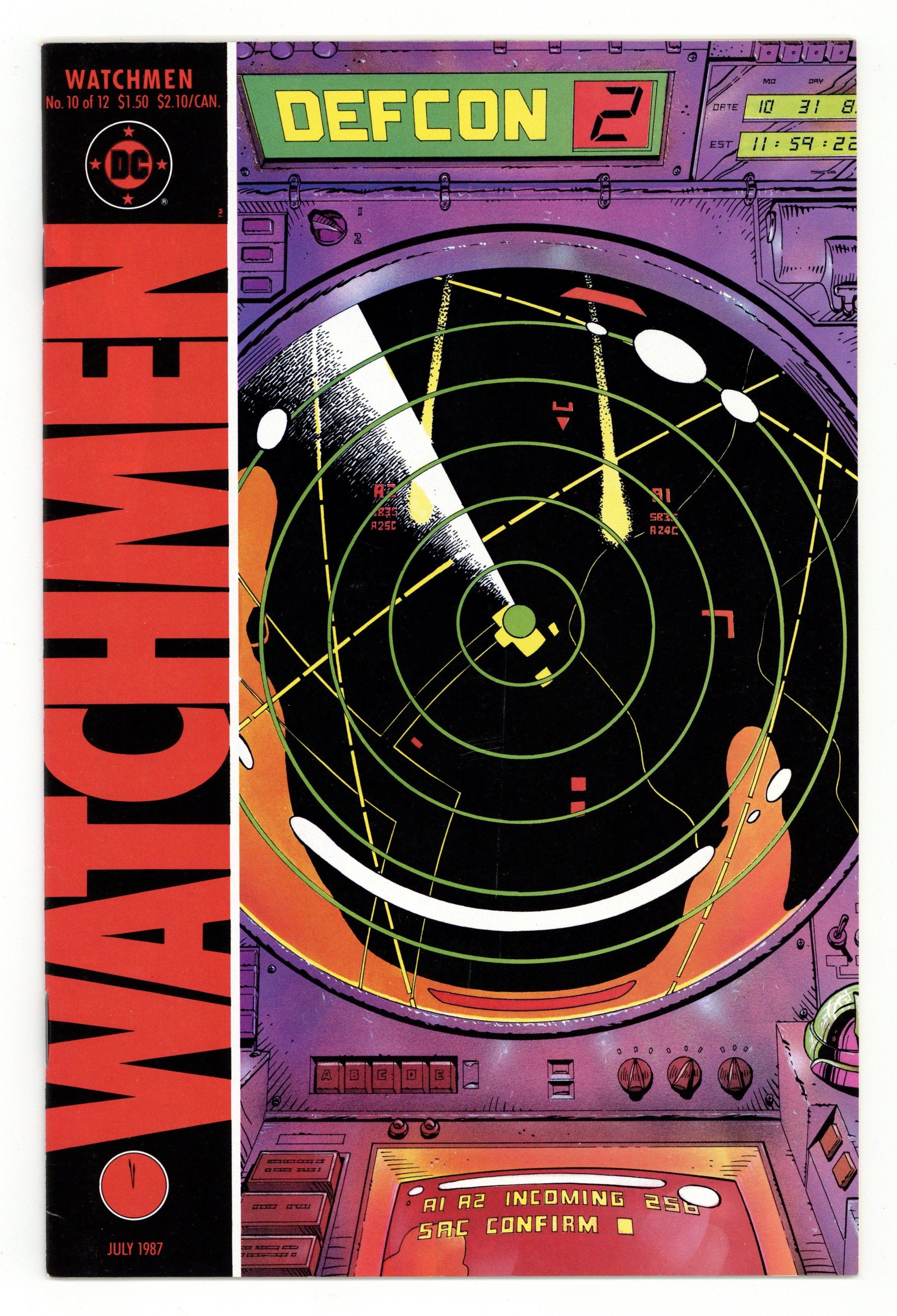 $22.50"Two riders were approaching". Part 10 of 12. Story by Alan Moore. Art and cover by Dave Gibbons. Rorschach and Night Owl continue their detective work and finally discover who is behind the conspiracy. This is not a good thing. Includes four page fictional text feature with a view of Adrian Veidt's scrapbook. 32 pages. Full color. No ads. Cover price $1.50.