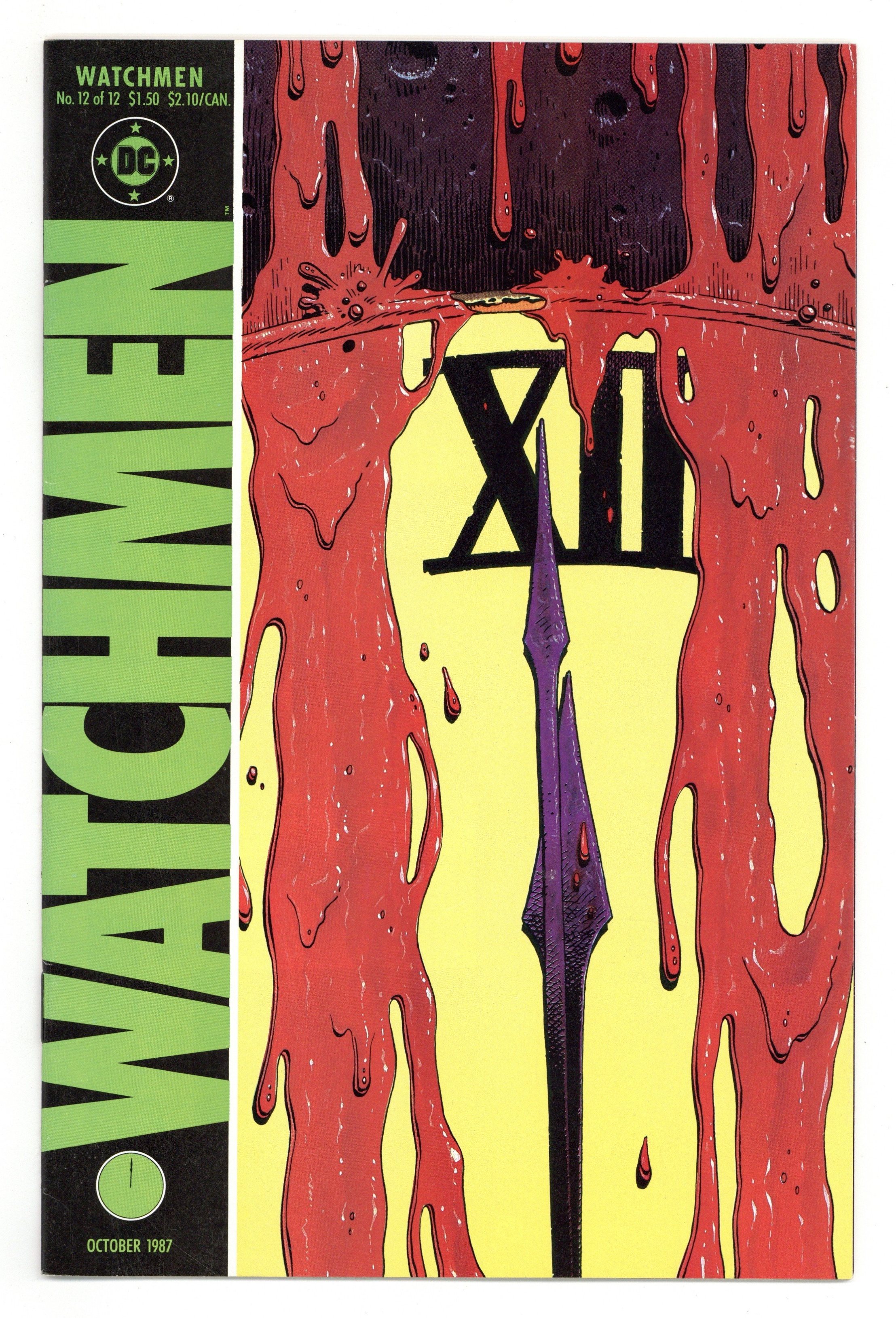 "A strong and loving world". Part 12 of 12. Story by Alan Moore. Art and cover by Dave Gibbons. All plotlines converge as the fates of all the characters are revealed. The final chapter of maybe the greatest series in comics history. 32 pages. Full color. No ads. Cover price $1.50.