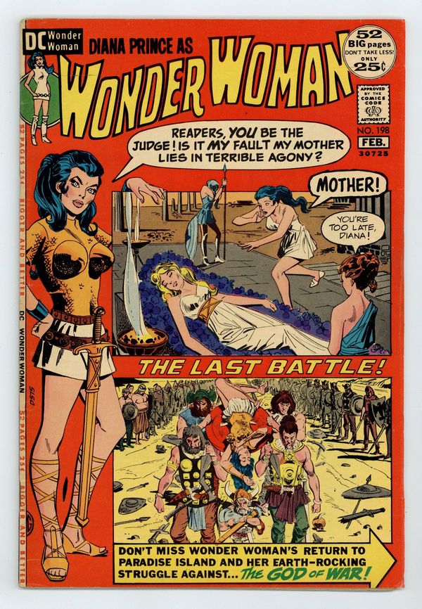 48-page giant. Cover by Dick Giordano. "Return to Paradise Island!", script and pencils by Mike Sekowsky, inks by Dick Giordano; A messenger brings Diana back to Paradise Island, which has been attacked by Ares, who seeks to wrest the secret of inter-dimensional travel from Hippolyta; Felled in the initial battle, Hippolyta lies in a coma, and so it falls to Diana to make the decision to fight on; Horribly outnumbered and battered by another battle, Diana must come up with a new plan to turn the tide; Diana crosses dimensions looking for legendary heroes to gather to repel Ares' hordes, but the heroes refuse her call, though the valkyries led by Brunhilde join the Amazons; But as the women fall in battle, the heroes arrive and rout Ares' warriors. Reprints Wonder Woman 183 and 184. 52 pages, Full Color. Cover price $0.25.