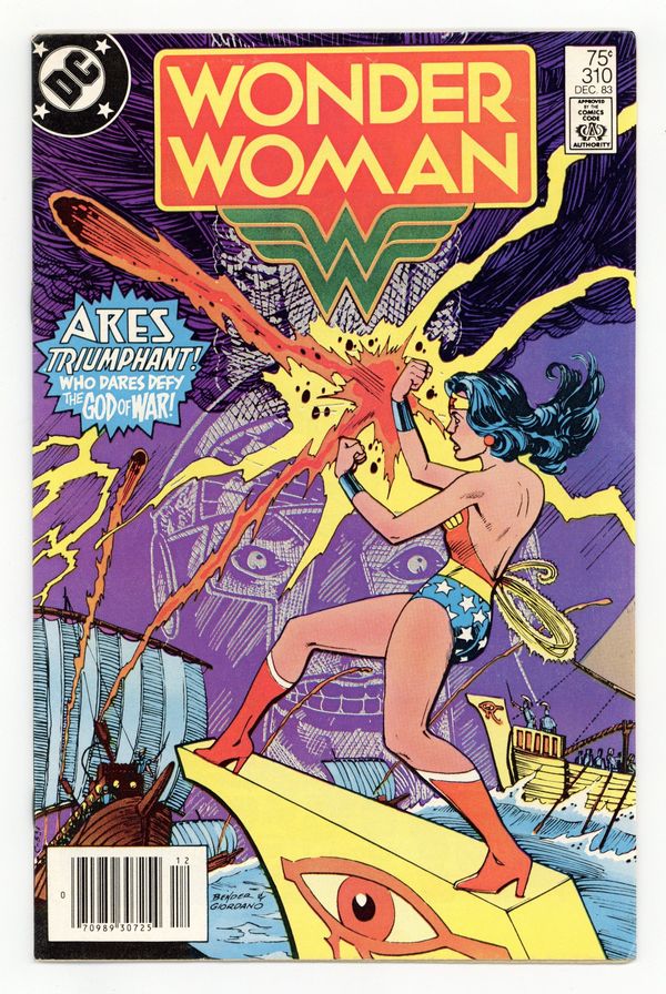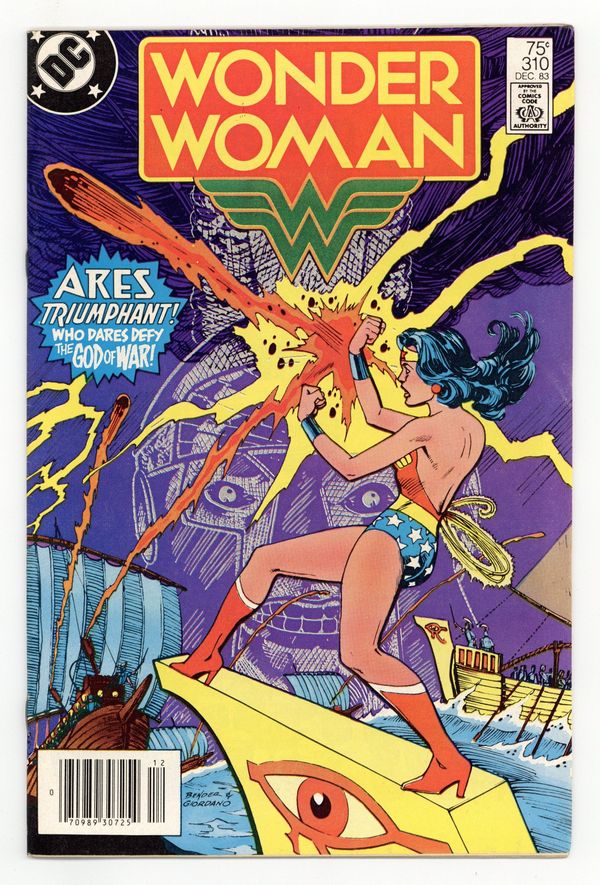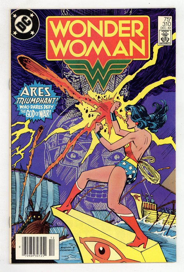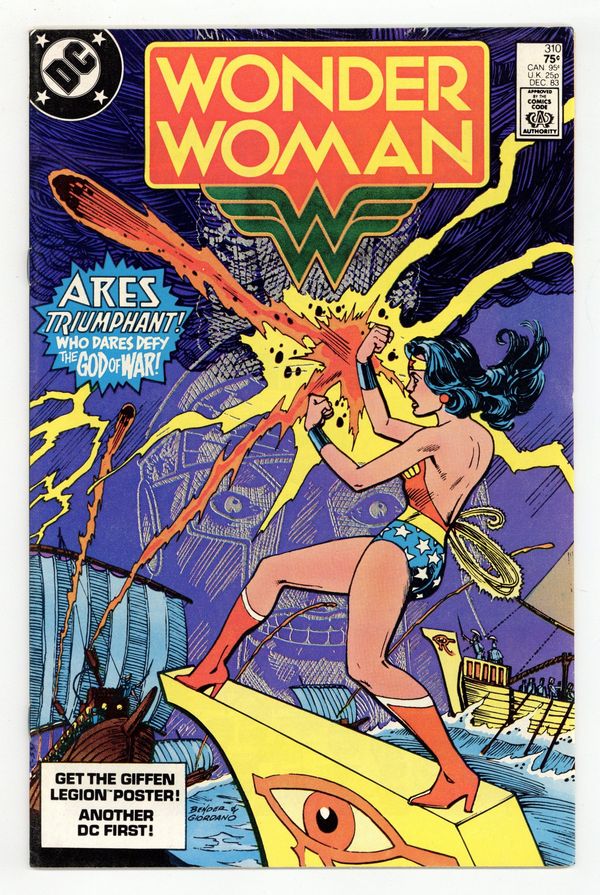 Tags: Wonder Woman$16.50First 75-cent cover price. Cover pencils by Howard Bender, inks by Dick Giordano. "All's Fair," script by Dan Mishkin, pencils by Mark Beachum, inks by Pablo Marcos; When Black Canary thinks that Wonder Woman should not reveal her secret identity to Steve Trevor as she is contemplating doing, she tells Dinah the story of how, in ancient times, Artemis, the first Wonder Woman, fell into a trap of Aress and was corrupted by not confessing her love for Cleon, a Greek soldier. "Avenue XX," script by Joey Cavalieri, pencils by Tim Burgard, inks by Rodin Rodriguez; Huntress vs. Earthworm. 36 pages, Full Color. Cover price $0.75.