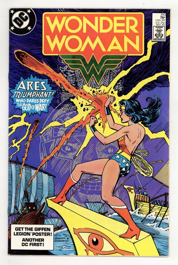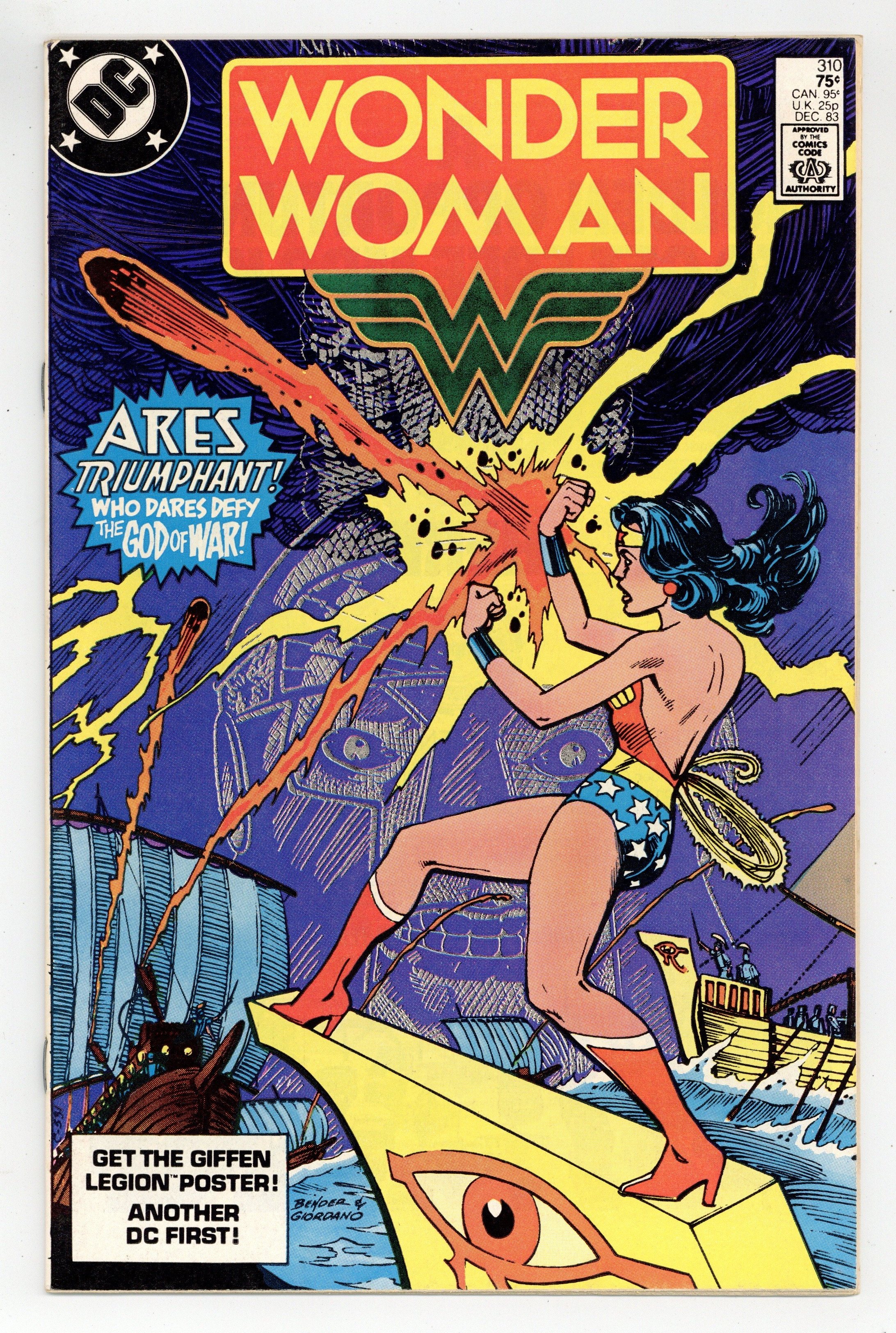 Tags: Wonder Woman$19.50First 75-cent cover price. Cover pencils by Howard Bender, inks by Dick Giordano. "All's Fair," script by Dan Mishkin, pencils by Mark Beachum, inks by Pablo Marcos; When Black Canary thinks that Wonder Woman should not reveal her secret identity to Steve Trevor as she is contemplating doing, she tells Dinah the story of how, in ancient times, Artemis, the first Wonder Woman, fell into a trap of Aress and was corrupted by not confessing her love for Cleon, a Greek soldier. "Avenue XX," script by Joey Cavalieri, pencils by Tim Burgard, inks by Rodin Rodriguez; Huntress vs. Earthworm. 36 pages, Full Color. Cover price $0.75.