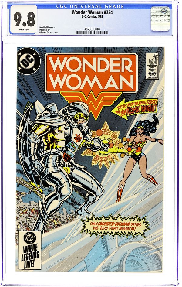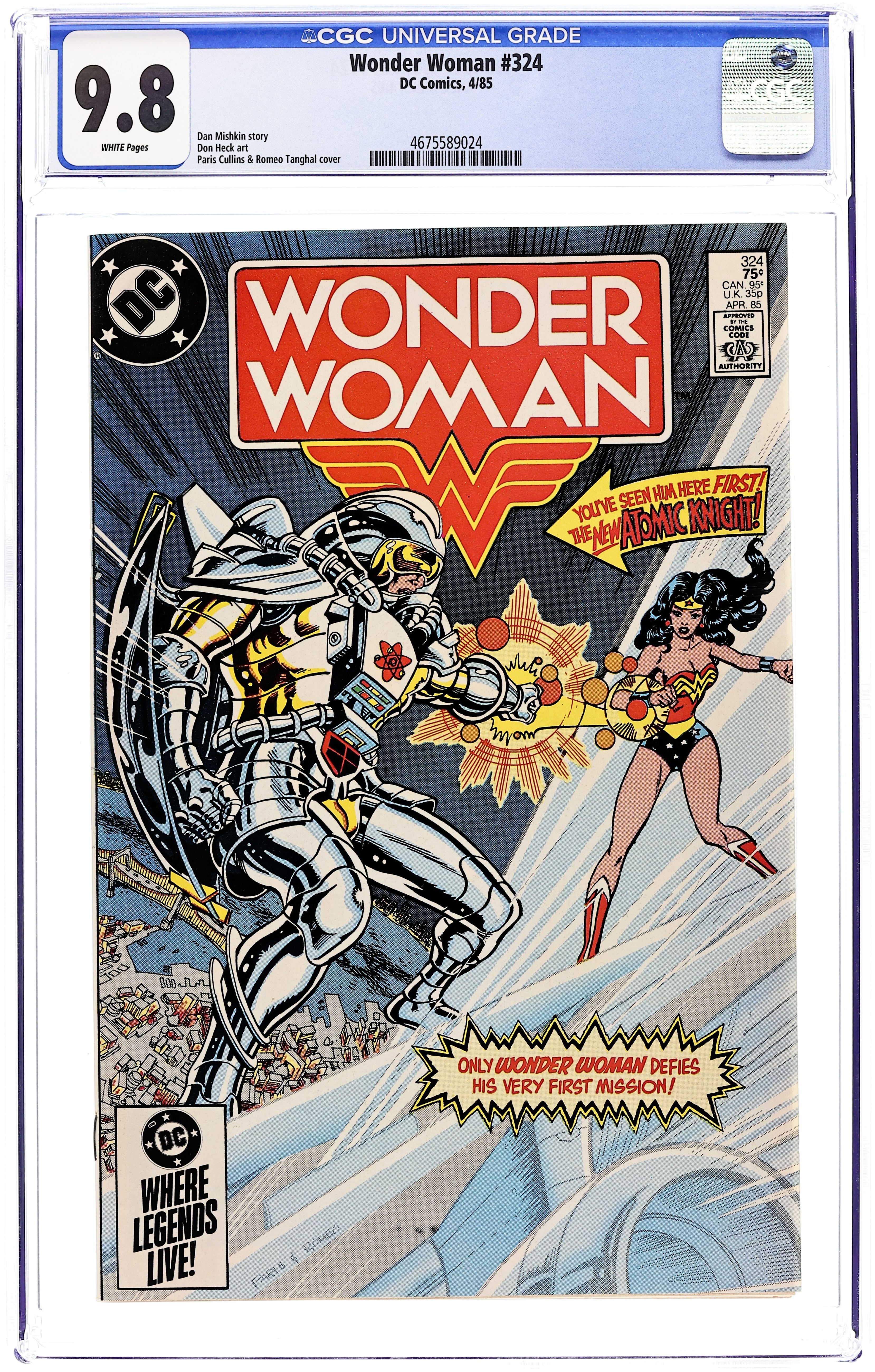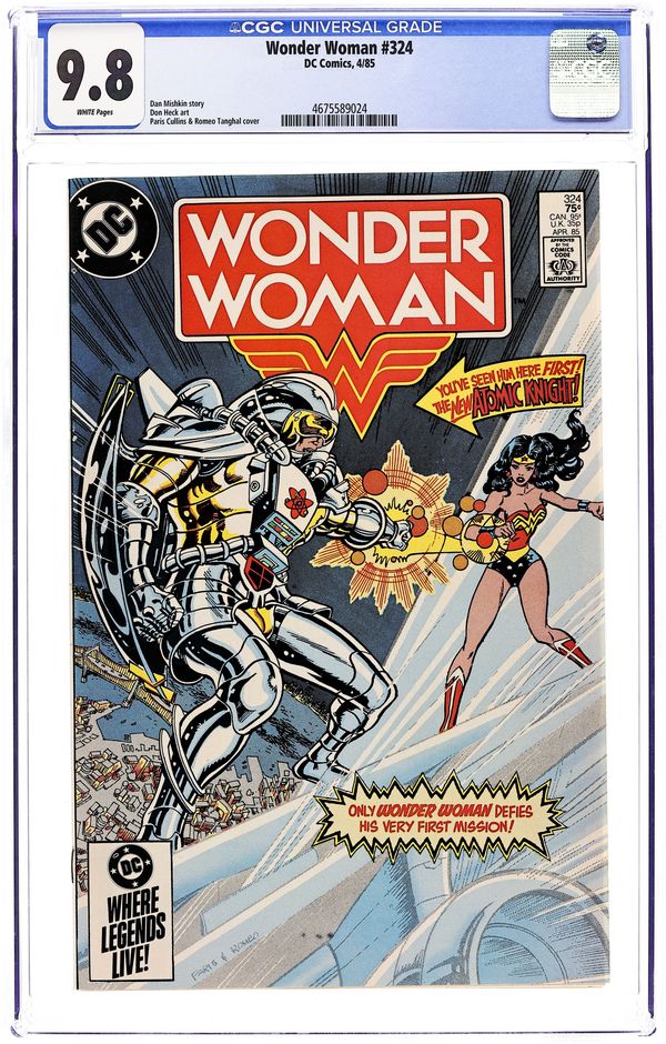 Direct Edition. You've seen him here first! The new Atomic Knight! Only--Wonder Woman defies his very first mission in "The Cassandra Complex"! Written by Dan Mishkin, with art by Don Heck. Characters: Wonder Woman; Atomic Knight [Gardner Grayle] (intro); Steve Trevor; Glitch; Hippolyta; Lisa Abernathy; Etta Candy; Cassandra; Major Keith Griggs; General Darnell; Eloise Abernathy; Paula; Sofia. Cover by Paris Cullins and Romeo Tanghal. 36 pages, Full Color. Cover price $0.75.