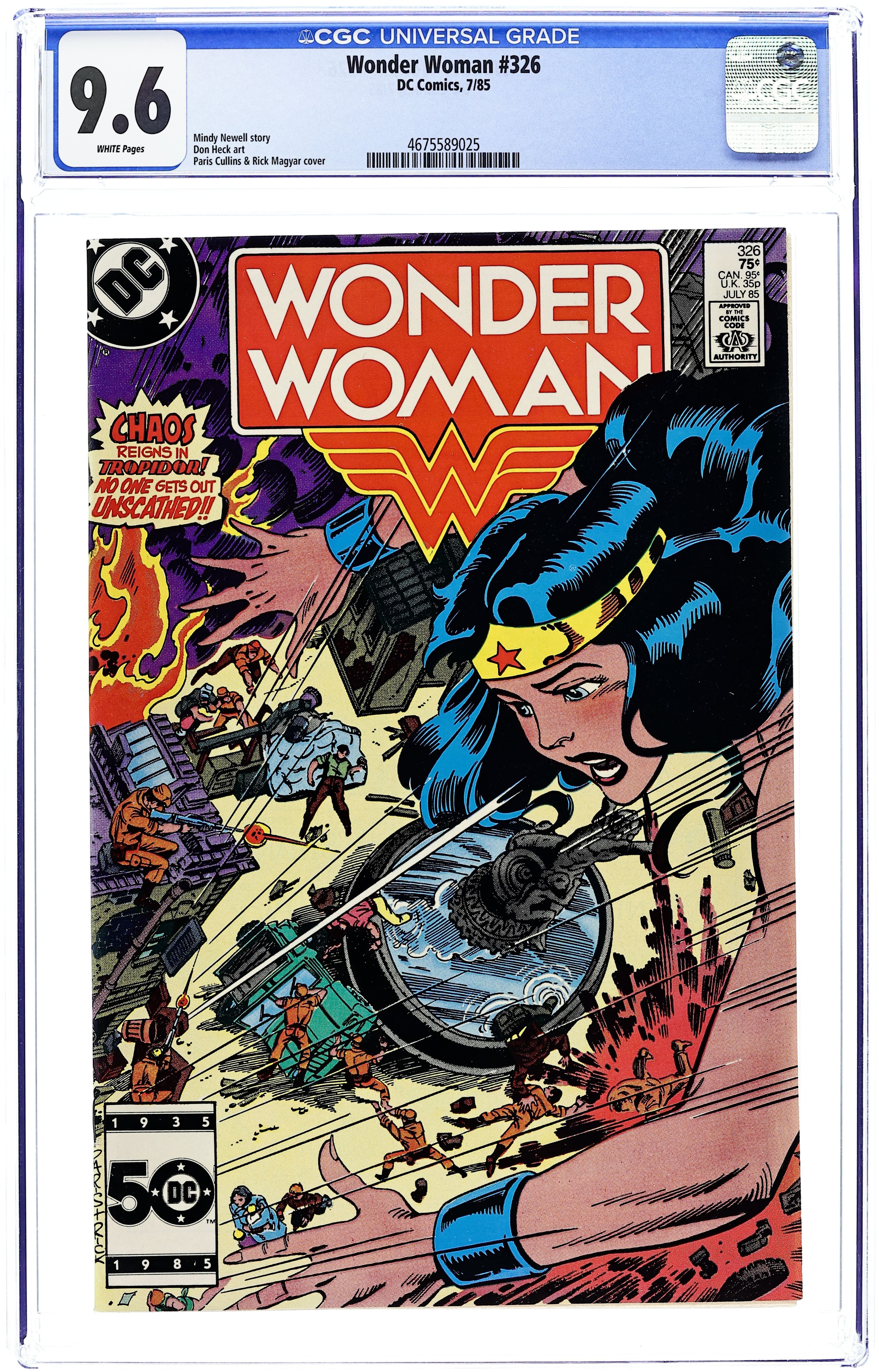 Direct Edition. Cover pencils by Paris Cullins, inks by Rick Magyar. "Tropidor Heat," script by Mindy Newell, art by Don Heck; Wonder Woman follows Keith Griggs and Lauren Haley to the Central American nation of Tropidor on an investigative mission, and turns up Tezcatlipoca. 36 pages, Full Color. Cover price $0.75.