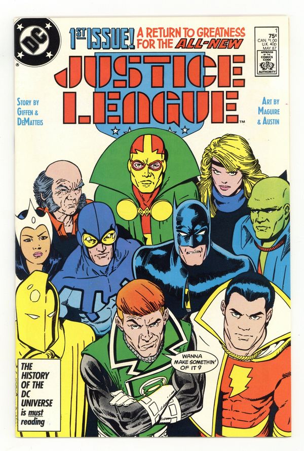 Direct Edition. When terrorists take the U.N. General Assembly hostage, Doctor Light (Kimiyo Hoshi) calls on the newly formed Justice League for help in "Born Again". Plot and breakdowns by Keith Giffen, script by Giffen and J.M. DeMatteis, pencils by Kevin Maguire, inks by Terry Austin. Batman, Guy Gardner, Black Canary, Mr. Miracle, Oberon, Captain Marvel, Martian Manhunter, Blue Beetle, Dr. Fate, Maxwell Lord. Maguire/Austin cover. Cover price $0.75.