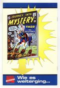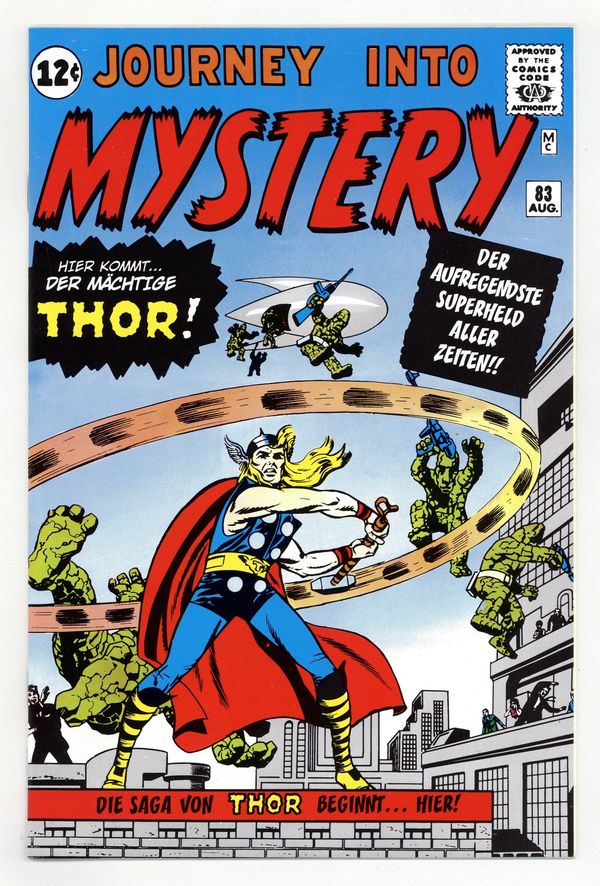 Reprints the original Journey Into Mystery #83 in German. Distributed as an exclusive bonus comic in a foreign comic multi-pack (Marvel Jubiläum Pack 8) with four other Marvel Deutschland comics. Cover pencils by Jack Kirby, inks by Joe Sinnott. First appearance and origin of Thor in "The Stone Men from Saturn!," script by Stan Lee (plot) and Larry Lieber (script), pencils by Jack Kirby, inks by Joe Sinnott; A lame doctor vacationing in Norway runs across an alien invasion; While hiding from the aliens in a cave he finds an old cane that transforms him into the god Thor; Thor drives back the alien invasion. "Discovery" two-page text story, art by Joe Maneely. "The Perfect Crime," script by Stan Lee, art by Don Heck; A crook tries to kill and rob a man by pushing him off a cliff, but finds that he is a flying man from Mercury. "When the Jungle Sleeps," script by Stan Lee, art by Steve Ditko; A lion is given superhuman intelligence by a nuclear test; It plans to attack humanity, but quickly loses its enhanced intelligence. Cover price $0.12.