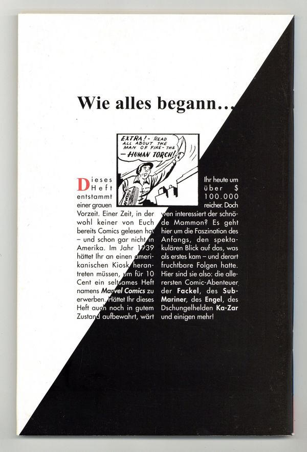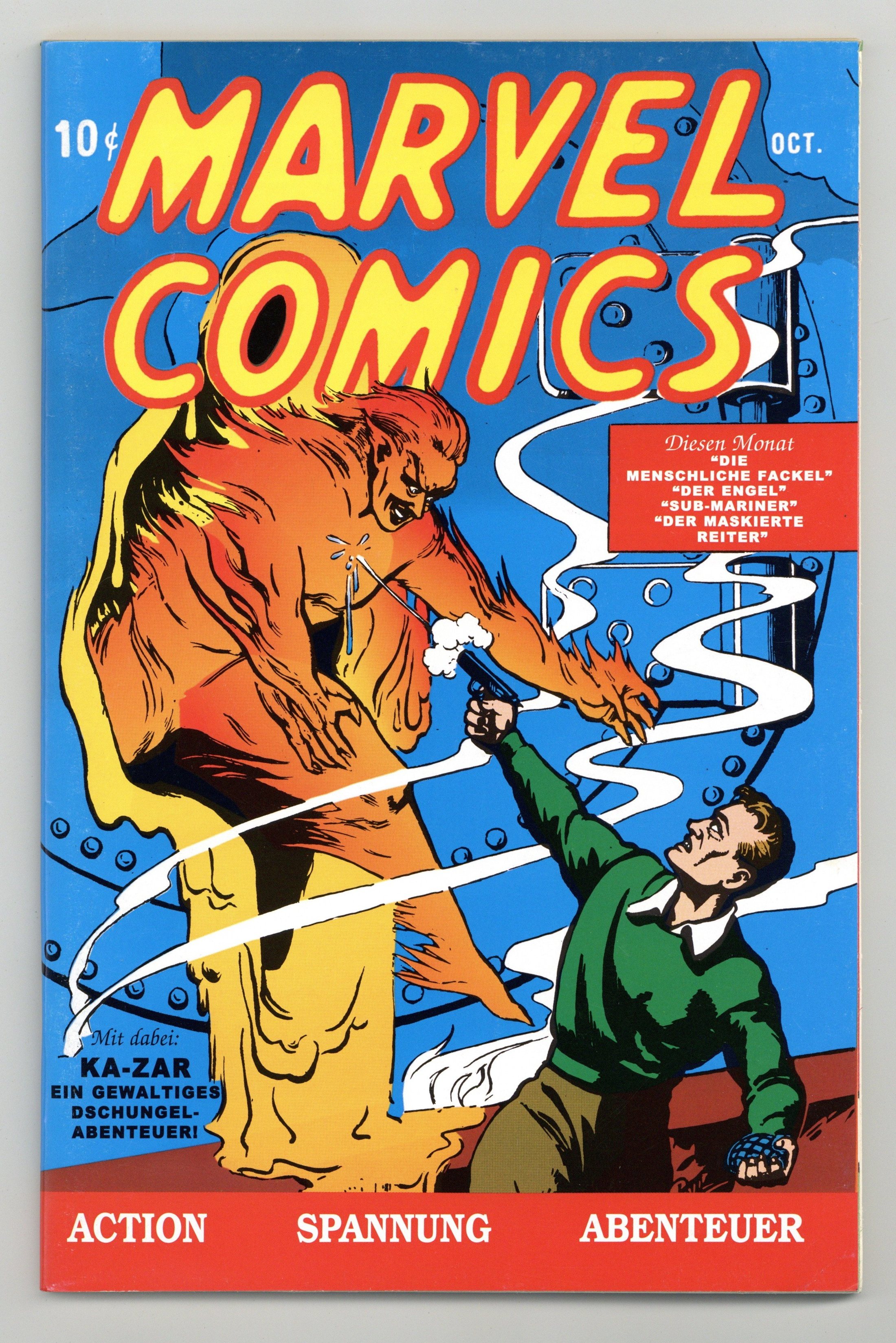 $39.00Reprints the original Marvel Comics #1 in German. Distributed as an exclusive bonus comic in a foreign comic multi-pack (Marvel Jubiläum Pack 8) with four other Marvel Deutschland comics. Origin Sub-Mariner (by Bill Everett; 1st 8 pages were produced for Motion Picture Funnies Weekly # 1). Intro Human Torch (by Carl Burgos), Kazar the Great (1st Tarzan clone), the Angel (by Paul Gustavson), the Masked Ranger and his horse Lightning, and Jungle Terror (only appearance). 2-page text story, "Burning Rubber" (by Raymond Gill). Cover by science fiction pulp illustrator Frank R. Paul. 64 pages. Cover price $0.10.