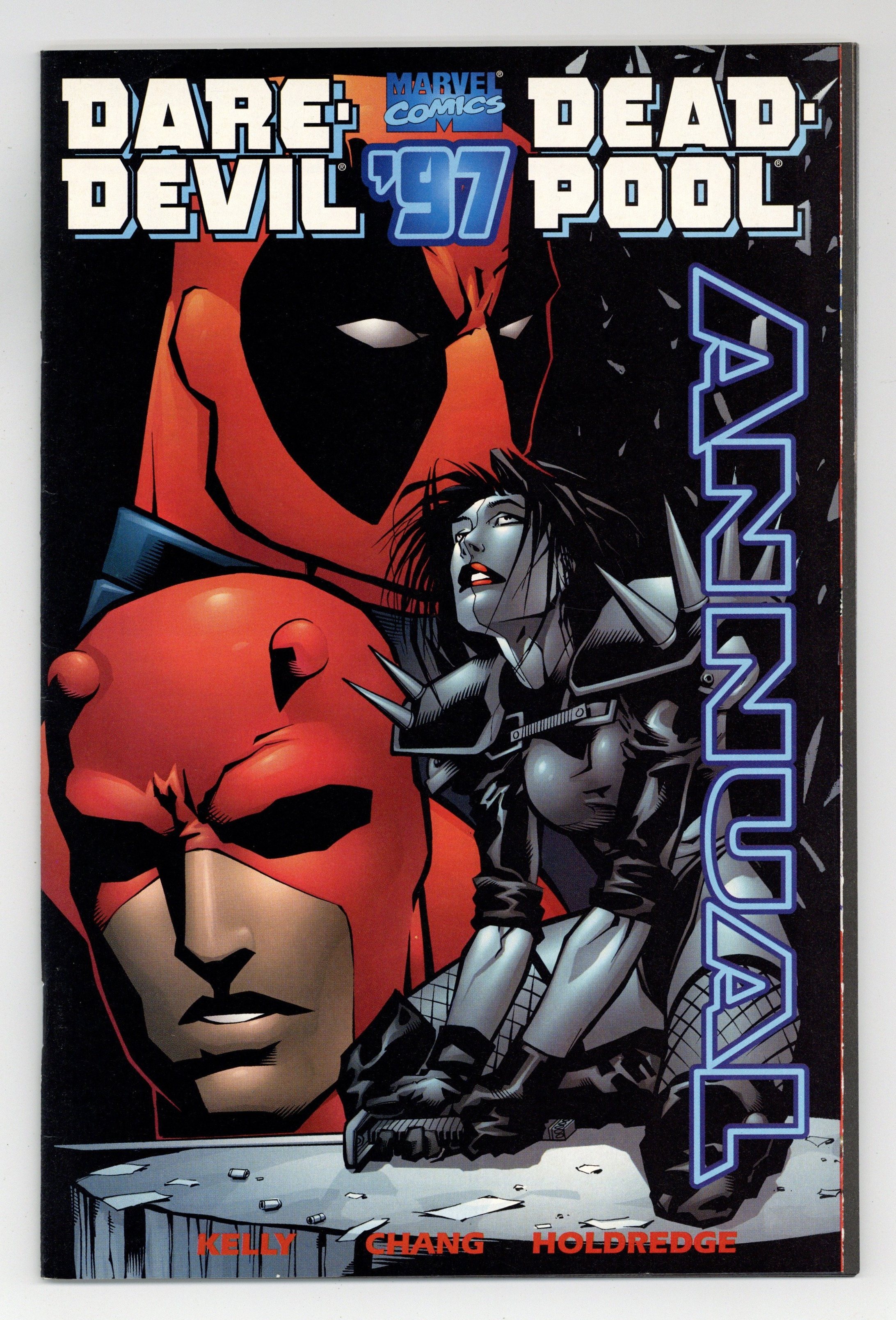 "Whomsoever Fights Monsters..." Written by Joe Kelly. Pencils by Bernard Chang. Inks by Jon Holdredge. Typhoid Mary, that schizoid sweetie from Daredevil's past, returns to her old stomping grounds to exact revenge on everyone who's ever screwed her over, including DD! Now Deadpool's on her tail, but whose side is he on? And you must not miss the subplot featuring the most popular supporting cast member of them all, Deuce the Devil Dog! Cover price $2.99.