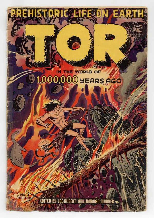Cover by Joe Kubert. Stories and art by Joe Kubert, Alex Toth and Norman Maurer. Numbering continues from 3-D Comics Tor (1953 St. John) #2C. Comics legend Joe Kubert won fans early in his career with his tales of Tor, a caveman struggling for survival in a world where humans co-exist with dinosaurs. Tor tries to help a tribe escape a volcanic island that is collapsing into the sea. Tor defends a village from the raiding Flatnose tribe, and helps an all-female tribe settle differences with their neighbors. Co-creators Joe Kubert and Norman Maurer put themselves into the comic to discuss the science and history of the Tor series. Plus full-page dinosaur illustrations (including a pteranodon) by Kubert. Isle of Fire!; Snow Trap; Black Valley; 1,000,000 B.C. History of Prehistoric Animals: Pteranodon, Tylosaurus; Danny Dreams. 32 pages, Full Color. Cover price $0.10.