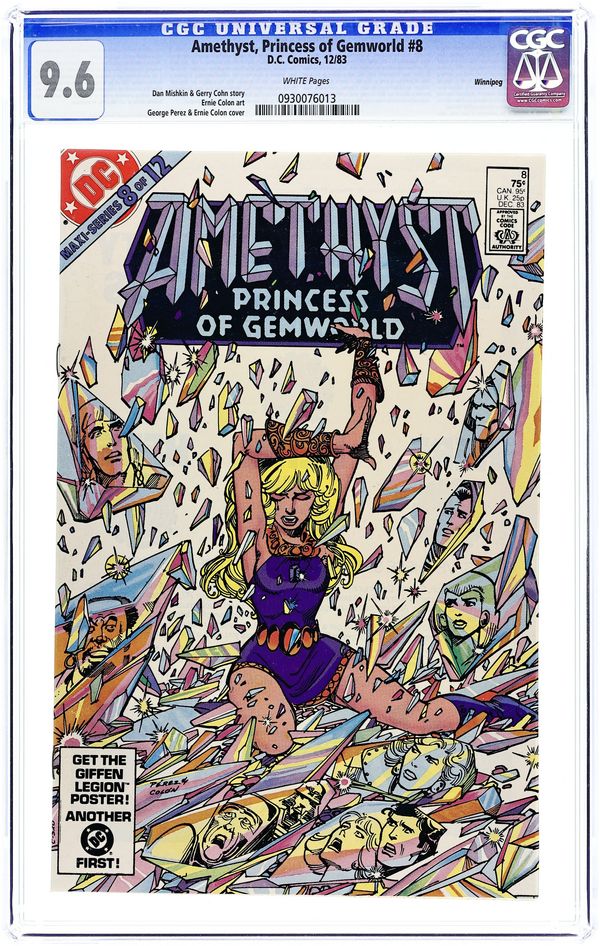 First 75-cent cover price. Cover pencils by George Perez, inks by Ernie Colón. "First Light," script by Dan Mishkin and Gary Cohn, art by Ernie Colón; Dark Opal has convinced some dangerous characters to help him in his battle against Amethyst and her allies; Amethyst realizes she must increasingly direct her people and lead them to the expectations they have toward her; The origin of Gemworld. 36 pgs., full color. Cover price $0.75.