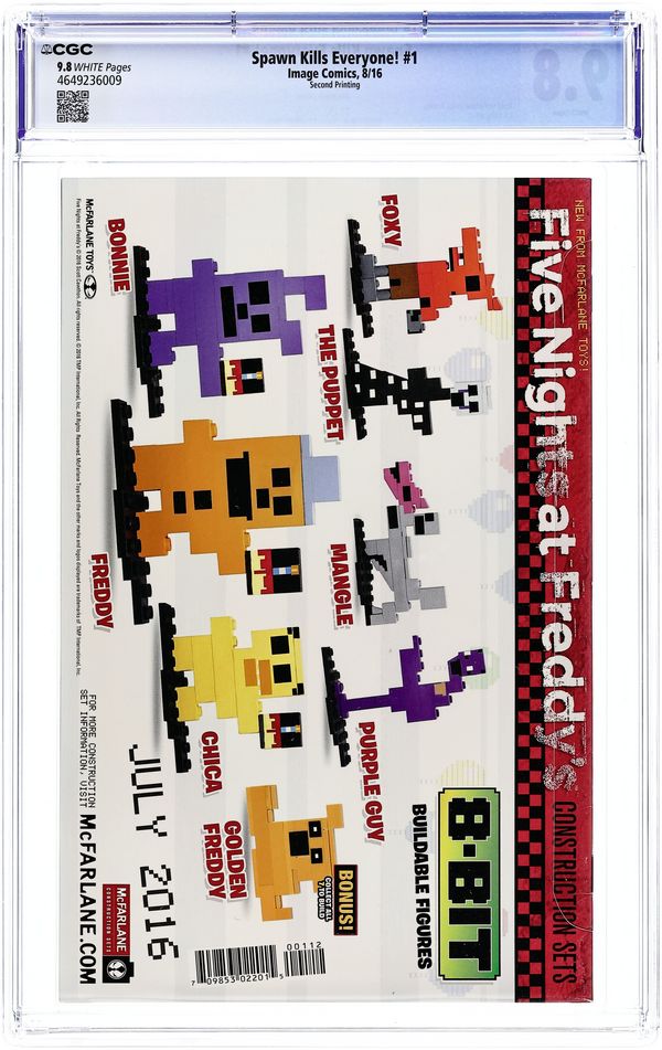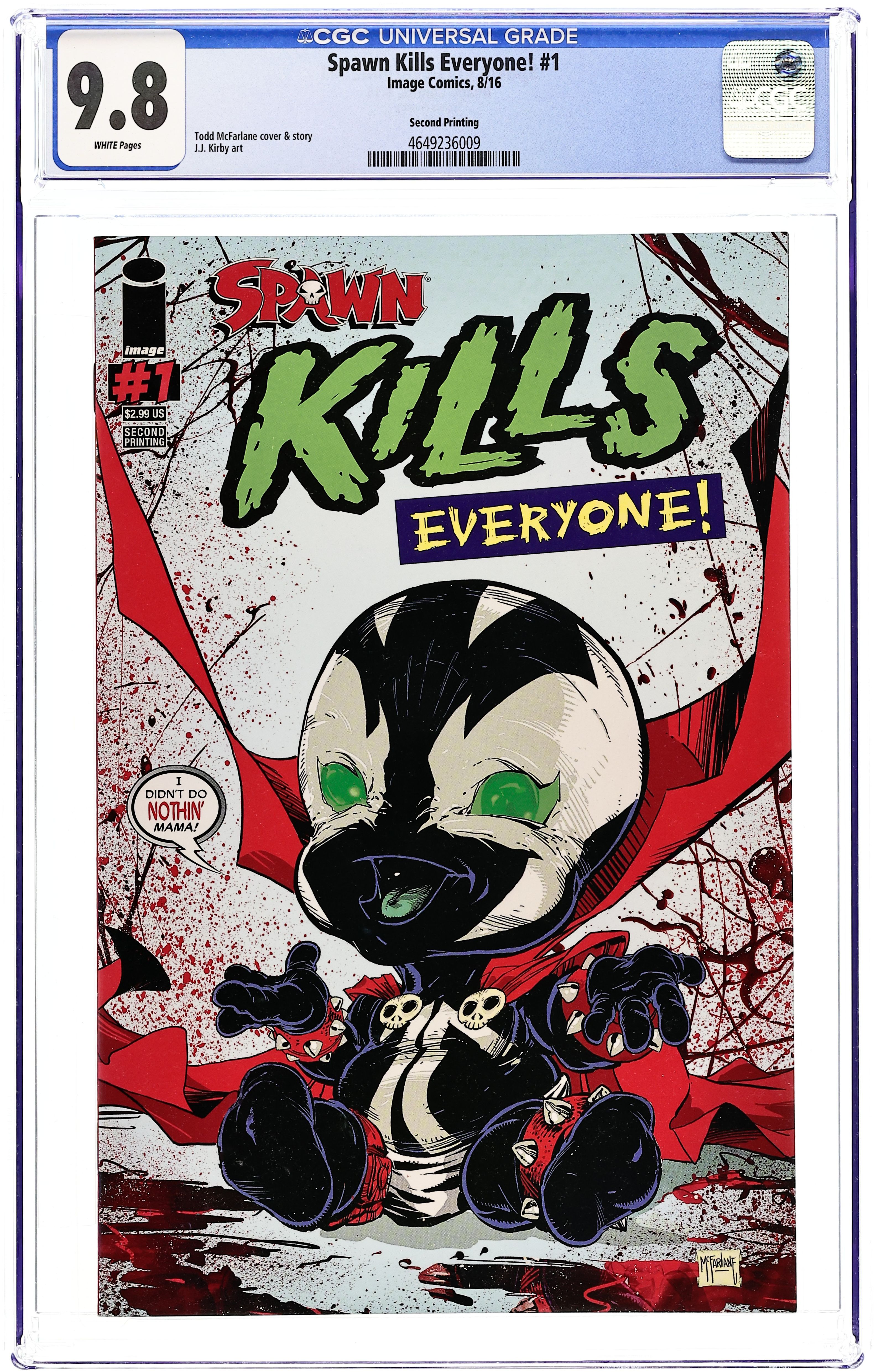 2nd Printing. Written by Todd McFarlane. Art by J.J. Kirby. Cover by Todd McFarlane. Do you have a favorite hero?! Better change it… they're DEAD! If you ever wondered who the strongest hero is, THIS BOOK ANSWERS IT! It's SPAWN… he kills EVERY HERO! 28 pages, full color. Cover price $2.99.