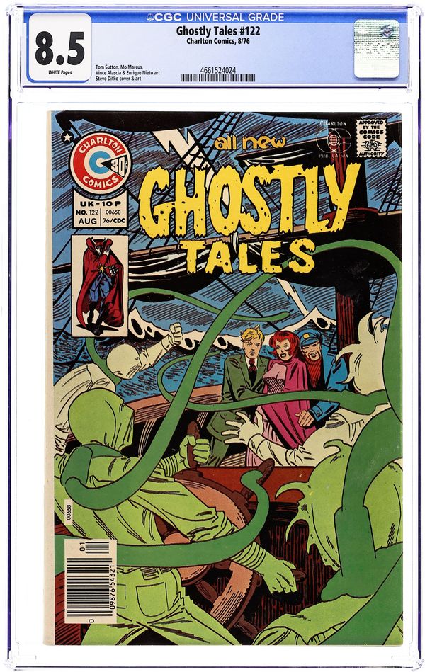 Cover by Steve Ditko. Stories and art by Steve Ditko, Enrique Nieto, Joe Gill, Mo Marcus, and Vince Alascia. A horror anthology from Charlton that often featured work by Steve Ditko and other comics luminaries. Captain Munson, a former hangman, pilots a ship haunted by the ghosts of the men he has killed, in a story with art (and cover) by Spider-Man co-creator Steve Ditko. Abusive farmer Potter, who looks like a shirtless Black Adam, gets an ironic comeuppance. The Stinger!; Secret of a Superstar; The Crew That Was Hanged!; The Last Bite. 32 pages, Full Color. Cover price $0.30.