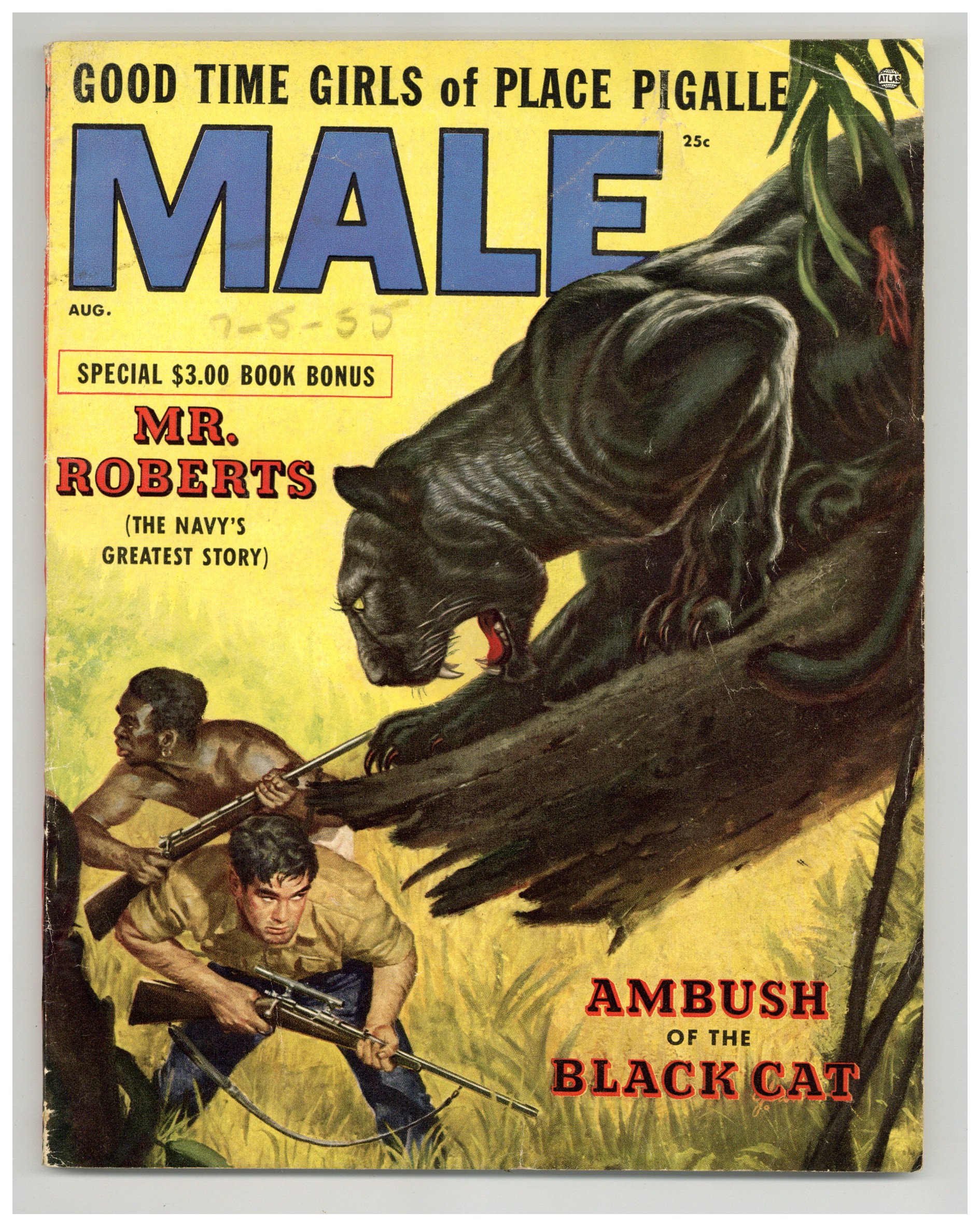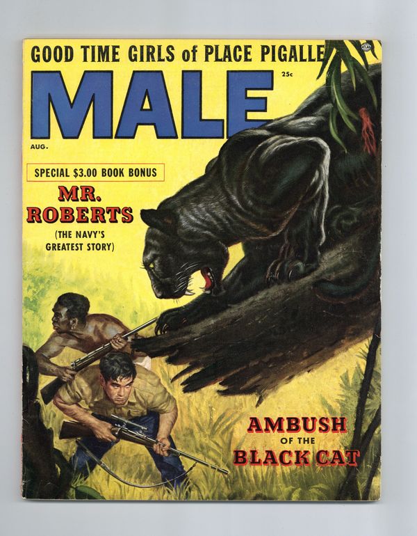 Published Aug 1955 by Male Publishing Corp..$19.00Volume 5, Issue 8 - August 1955. Adventure stories, articles and nude photos. 8 1/2-in. x 11-in. 98 Pages B&W. Cover price $0.25.