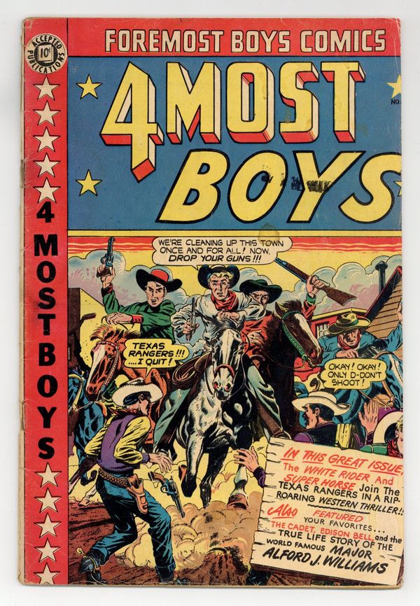 Cover by L. B. Cole. Stories and art by Mickey Spillane and Harold de Lay. Adventures of clean-cut teen heroes of the 1940s, reprinted from L.B. Cole's Star Publications. Edison Bell and Jerry use a code on a bookshelf to catch a fugitive bank robber, in the final adventure of the boy inventor. Kit and Dan and the other cadets join forces with local farmboys to try to save the dam from washing out and flooding the valley, in the final Cadet adventure. A 2-page (prose) story by future hardboiled detective author Mickey Spillane. White Rider and Superhorse; Edison Bell; Creature of the Deep; Major Alford J. Williams; The Cadet. 32 pages, Full Color. Cover price $0.10.