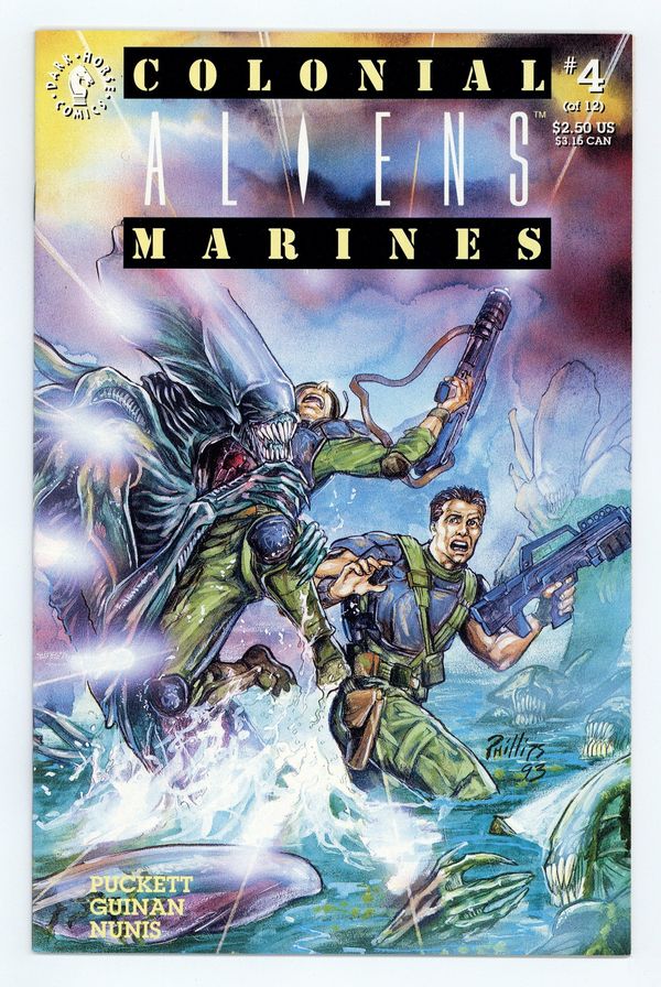 Published Apr 1993 by Dark Horse.$12.00Script by KELLEY PUCKETT. Art by PAUL GUINAN, ALLEN NUNIS, ANDE PARKS & TERRY PALLOT. Cover painting by JOE PHILLIPS. After barely escaping the rail-gun station, our not-so-happy band of Marines is looking forward to a little R&R on the backwater (and we do mean water) planet Bracken's World. Guess again! The mysterious "father" from last issue has already established a foothold on the dreary little planet, and isn't about to let Lt. Henry interfere with his schemes. Get ready for aquatic action and intrigue as our hapless heroes are betrayed from within by the only person that can save them! Cover price $2.50.