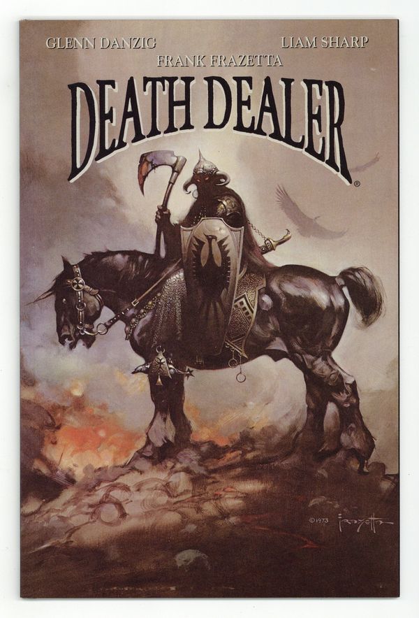 Painted cardstock cover art by Frank Frazetta. Untitled story, script by Glenn Danzig, art by Liam Sharp; Death Dealer seeks vengeance on more of his enemies. Ad for Frazetta Art Museum. Deluxe format. 52 pgs. $6.95. Cover price $6.95.