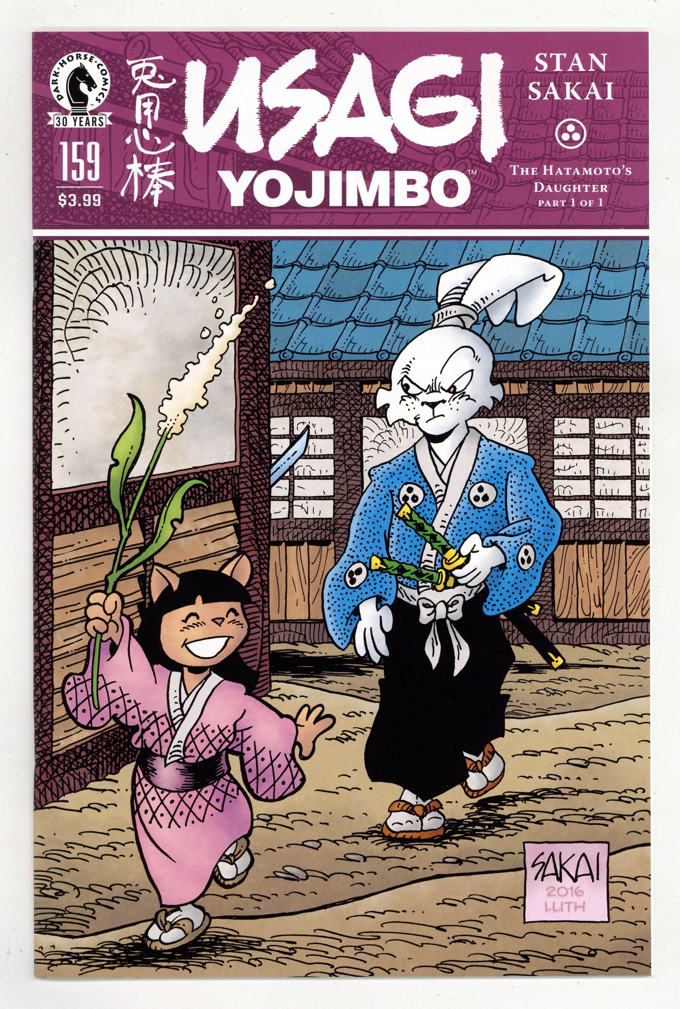 Published Nov 2016 by Dark Horse.$13.50Story, Art and Cover by Stan Sakai. During his travels, the rabbit ronin comes across a little girl cowering behind a tree. At first thinking she is alone, Usagi swiftly takes her under his protection after finding her father lying dead nearby. Unbeknownst to him, there are killers after her that will stop at nothing to obtain the information her father bestowed upon her prior to his death. o New self-contained issue! 24 pages, B&W. Cover price $3.99.