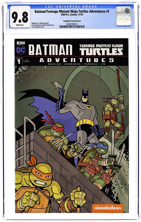 Limited 1 for 25 Retailer Incentive Variant Cover. Written by Matthew K. Manning. Art by Jon Sommariva. Cover by Ty Templeton. When villains start to mysteriously escape Arkham, Batman seeks to track them down. What happens when he discovers that they have left Gotham completely… and entered the TMNT's New York City? The animated worlds of the current TMNT Nickelodeon cartoon and Batman: The Animated Series collide in this outstanding mini-series! The greatest all-ages crossover of all-time! Featuring villains and allies from both universes! The influential Batman: The Animated Series returns to comics! 32 pages, full color. Cover price $3.99.