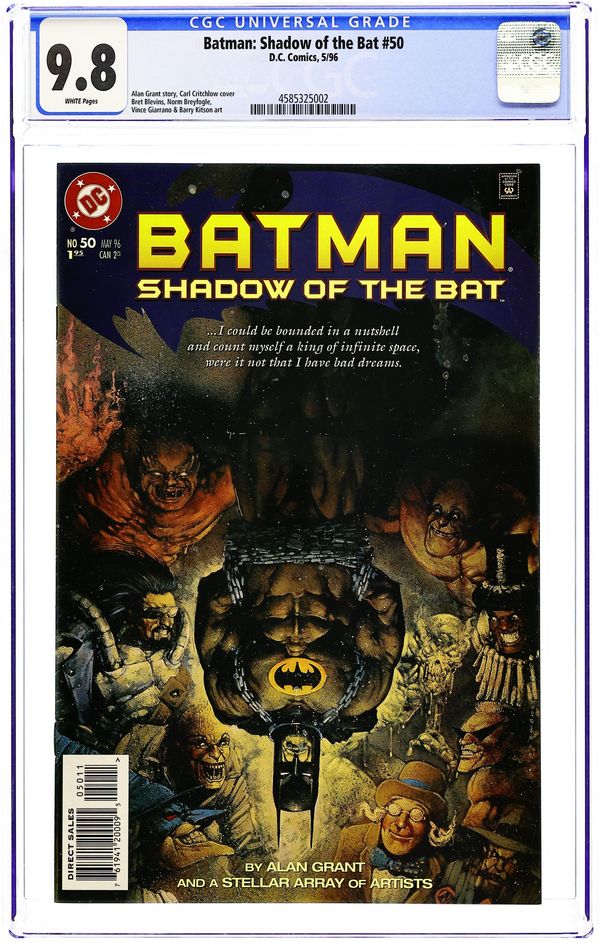 Painted cover art by Carl Critchlow. Written by Alan Grant. Pencils by Bret Blevins, Norm Breyfogle, Vince Giarrano, Barry Kitson, and Dave Taylor. Inks by Ray McCarthy and Rob Leigh. While chasing after a criminal at a chemical plant, Batman faces off against past enemies. But are they real or merely illusions? Story continues in next issue. 32 pgs. Full color. $1.95 cover price. Cover price $1.95.