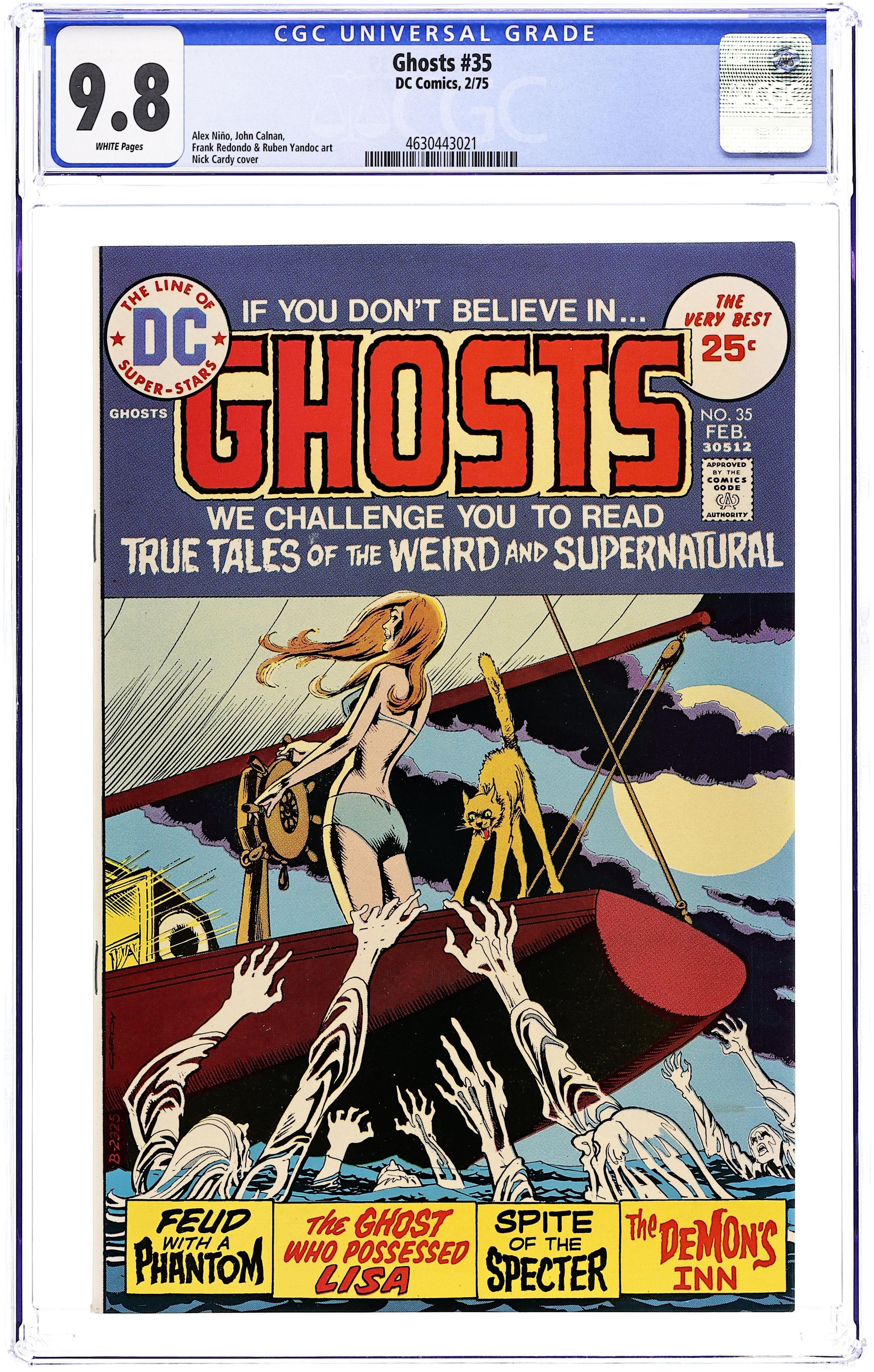 Cover by Nick Cardy. Stories by Murray Boltinoff (text story) and unknown. Art by Alex Nino, John Calnan, Ruben Yandoc, Frank Redondo and Frank Robbins (illo for text story). If you don't believe in ghosts...we challenge you to read true tales of the weird and supernatural! In this issue: "Feud with a Phantom" with art by Alex Nino; "The Ghost Who Possessed Lisa!" with art by John Calnan; "The Demon's Inn" with art by Ruben Yandoc; "The Spite of the Specter" with art by Frank Redondo; and 1-page text story "The Spirit That Seized a Soul" by Murray Boltinoff and Frank Robbins. 32 pages, full color. Cover price $0.25.