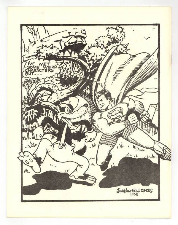 Published 1968 (est.) by No publisher listed/fanzine.$20.00Cover by Buddy Saunders, owner of Mycomicshop and Lone Star Comics. Buddy's cover stars the Timely Golden Age superhero The Vision. Published by Chuck Wooley in 1968. Larry Herndon's "Fandom's Library" continues, as does "A Listing Of Whitman Material" by Dale Manesis. Dale's installment is a very detailed alphabetical list of the Whitman BLBs, from Dick Tracy 1454 to Little Orphan Annie 1403. There are a lot of other features, including a list of current fanzines, a Panelology Quiz, a Krazy Kat article, and Justice Society portraits by Bill Wilson. For many, the highlight is three pages of photos from the 1968 Dallas SW convention. Pictured are Ken Finnerty, Larry and Irving Bigman, Chuck Wooley, Fritz Leiber, Larry Herndon, Tom Reamy, Gary Acord, Caz, Boyd and Dee, Paul McSpadden, Bill Wallace, and G. B. Love. "For Sale" ad highlights find Buddy Saunders offering Avengers 1 for $3.25, Spider-Man 13 for $1.25, Marvel Super Heroes 13 for 50c, and X-Men 4 at $1. The back cover is a humorous full page pin-up of Superman meeting the Big Bad Wolf, by Hollebeke. 8.5-in. x 11-in. 28 pages B&W. Cover price $0.50. Cover price $0.50.
