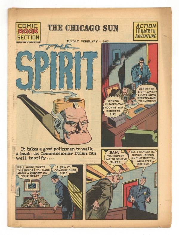 Spirit Weekly Newspaper Comic Insert. 7-1/2 x 10 inches, 16 pages, full color, all newsprint with no slick cover. Scripts/layouts by Eisner, Eisner/Nordling, Eisner/Mercer, or Spranger/Eisner; inks by Eisner or Eisner/Spranger.