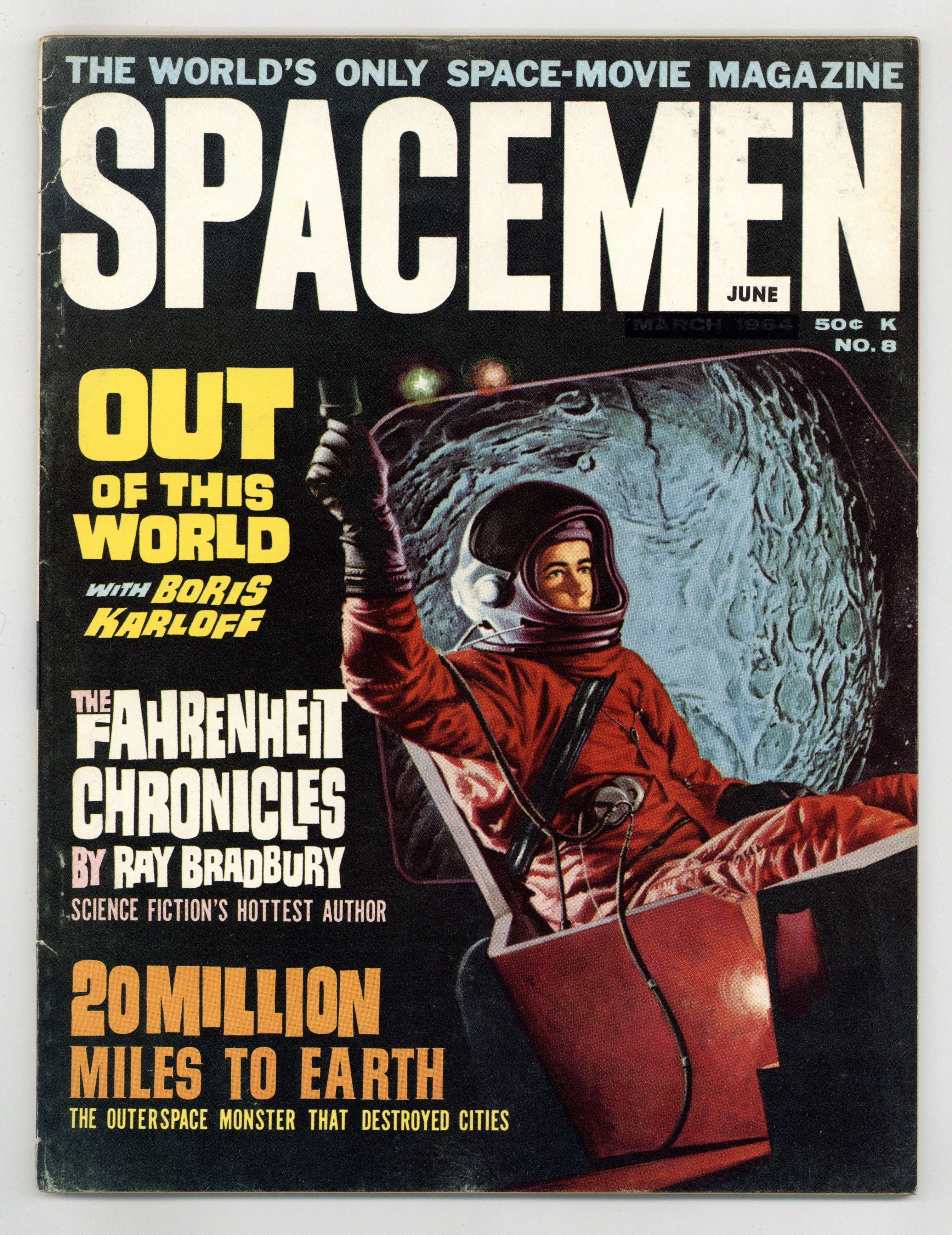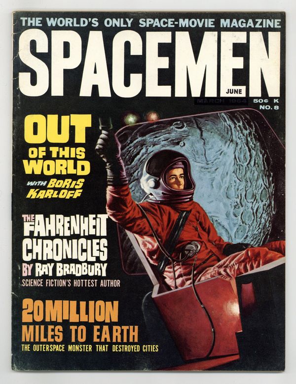 Cover by Basil Gogos. Stories and art by Forrest J. Ackerman and Ray Bradbury. A science fiction-themed spin-off of Famous Monsters of Filmland from the same editor-publisher team, Forrest J. Ackerman and James Warren. Part Three of Forrest Ackerman's examination of Fritz Lang's silent science fiction classic Metropolis. A novelization of the 1957 Ray Harryhausen classic 20 Million Miles to Earth. Science fiction author Ray Bradbury discusses the state of sci-fi film in the early '60s. Plus vintage ads for science and science-fiction products, including a "Genuine Official U.S. Government Surplus Space Suit." Space Screen; 20 Million Miles to Earth; Spacemen of Distinction; Most of the Cosmos; King of the Rocketmen; The Super Space; Orbitruary Dept.; Metropolis; The Fahrenheit Chronicles. Final issue of the series. 8 1/2-in. x 11-in., 64 pages, B&W. Cover price $0.50.