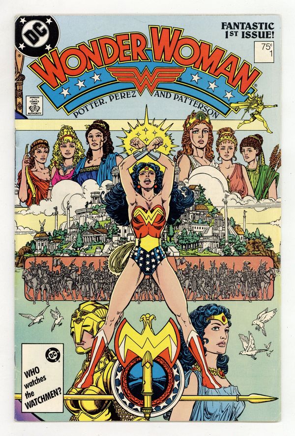 Starts Jan 3 "No Month" Variant. In this post-Crisis on Infinite Earths re-imagining of the Wonder Woman mythos, Diana is born of clay, growing on Paradise Island to become the champion of the Amazons. "The Princess and The Power!" Part 1 of 6, continued next issue. Script by Greg Potter, co-plot and pencils by George Perez, inks by Bruce Patterson. Perez inks first 2 pages and the final page. Wrap-around cover. No ads. Perez cover. 36 pgs. Cover price $0.75.