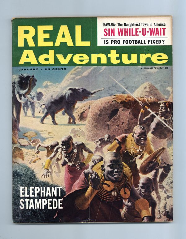 Published Jan 1957 by Hillman Periodicals.$7.00Volume B, Issue 1 - January 1957. Cover by William Robinson Leigh. Men's interest magazine featuring adventure stories and photos of buxom bombshells. 8 1/2-in. x 11-in. 98 pages B&W. Cover price $0.25.