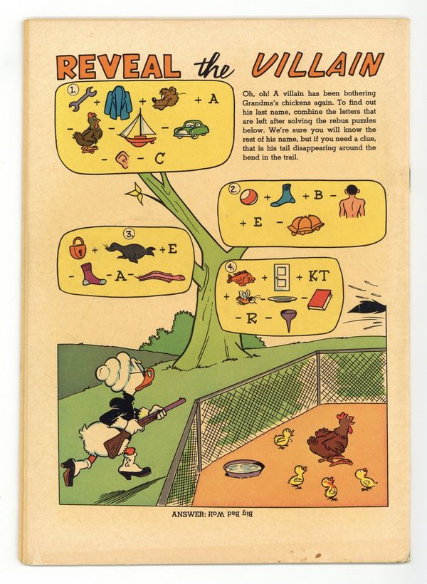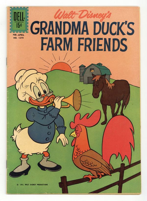Indicia title is "Walt Disney's GRANDMA DUCK'S FARM FRIENDS", No. 1279. Version with Reveal the Villain puzzle on back cover. Cover pencils by Pete Alvarado. Rural Mural, script and pencils by Bob Gregory, inks by Steve Steere; Daisy takes Grandma Duck to the city, where she sees an art exhibit by Grandma Jones and a mural painted on a wall. Timely Tip, script by Vic Lockman, pencils by Tony Strobl, inks by Steve Steere; Ludwig Von Drake comes to visit Grandma and tries to make her daily routine more efficient by using time and motion studies. The Big Barn Boo Boo, script by Vic Lockman, pencils by Tony Strobl, inks by John Liggera; Scrooge tries to hide his money by storing it in Grandma's barn, but the plan backfires. 36 pages, full color. Cover price $0.15.