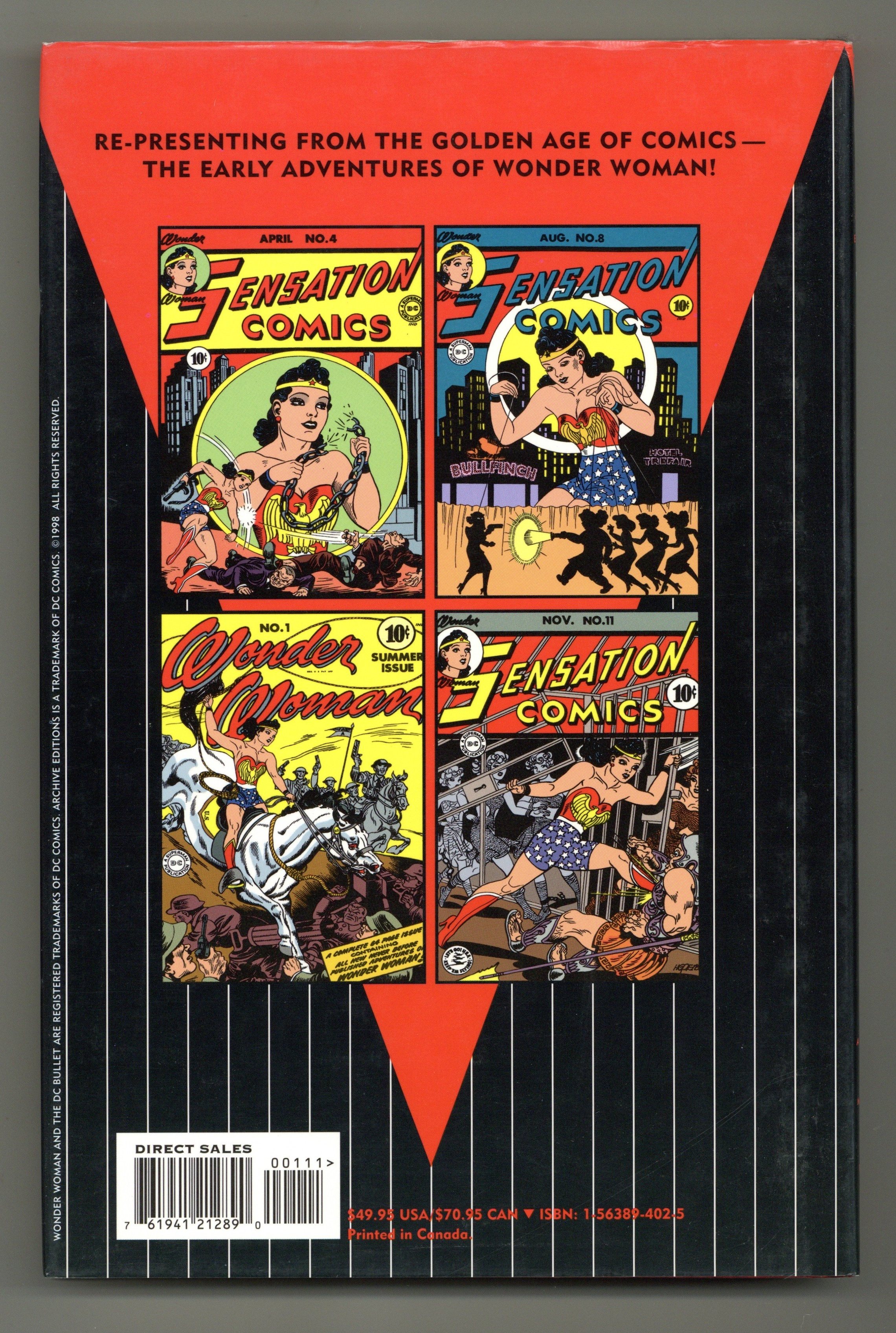 Volume 1 - 1st printing. Collects All Star Comics (1940-1978) #8, Sensation Comics (1942-1952) #1-12, and Wonder Woman (1942-1986 1st Series DC) #1. Written by William Moulton Marston. Art by H. G. Peter. Collected here are the first adventures of the world's greatest heroine, Wonder Woman. Originally printed in 1941, these classic tales tell the story of Diana, a young Amazon princess who leaves her home of Paradise Island to be an ambassador to the world of man. Included in this collection are the first appearances of Diana Prince, Wonder Woman's alter ego, Steve Trevor, her mother Hippolyta as well as Wonder Woman's bullet-deflecting magic bracelets and truth-inducing lasso. Hardcover, 240 pages, full color. Cover price $49.95.