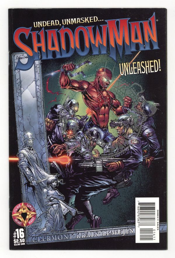 Glow-in-the-Dark edition. "Rebirth" - This month, Shadowman unveils its brand-new creative team! Writer Serge Clermont -- Voodoo aficionado and former New Orleans resident -- is going to send Shadowman in search of his final destiny and explore his powers to the fullest! Exciting new pencilling discovery Klayton Krain adds his unique brand of horrific storytelling! Having captured Shadowman, the coven that made him rips the Mask of Shadows right out of his chest! But he's far from helpless, and to the coven's dismay, Shadowman unleashes a beast he never knew he had! With his newfound power, Shadowman goes hunting for some answers...and payback. In the midst of this struggle, Mama Nettie gets her final justice! Written by Serge Clermont, with art by Klayton Krain and Temujin. Note: No longer a mature readers title. FC, 32 pgs. Cover price $2.50.