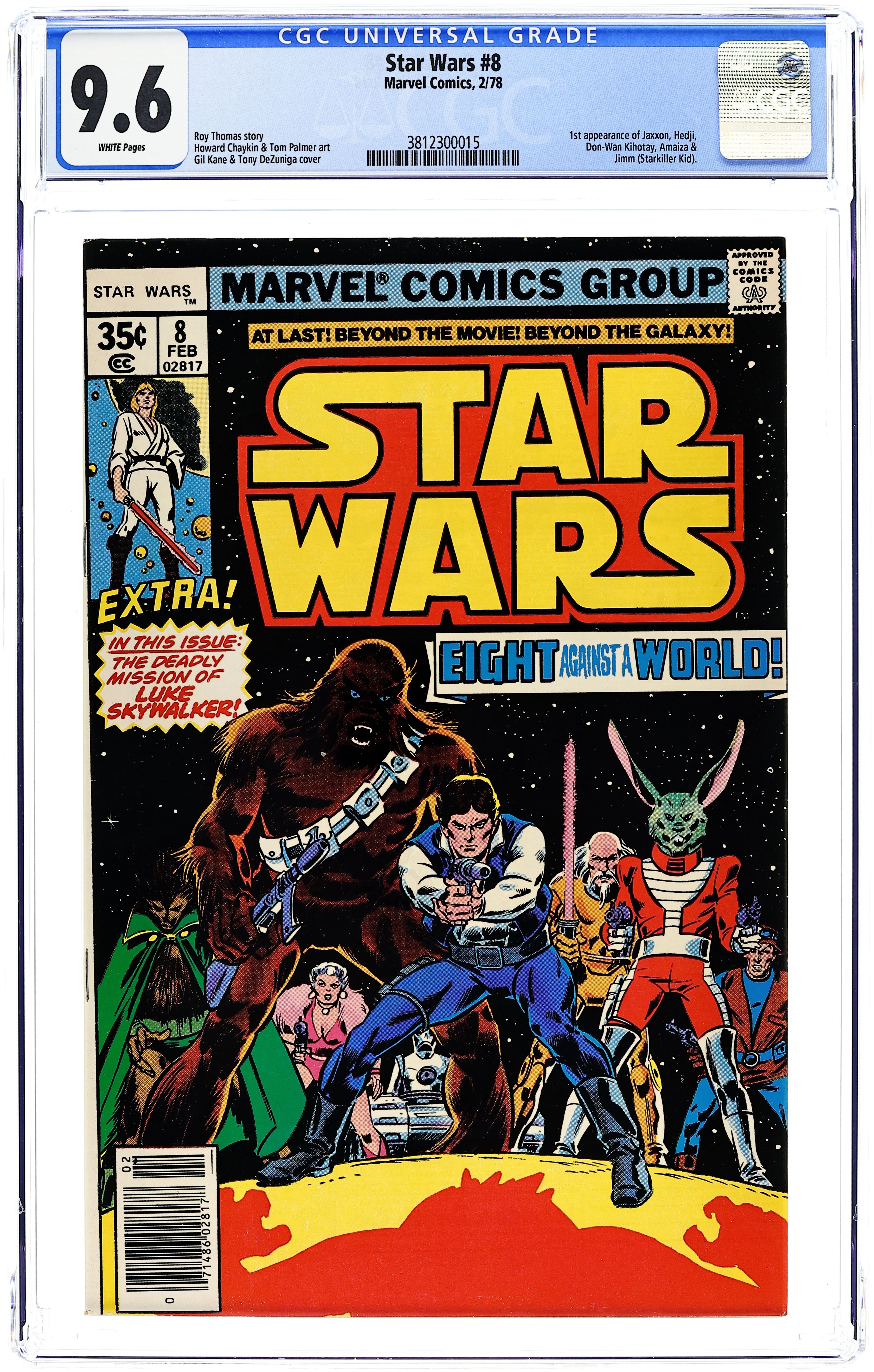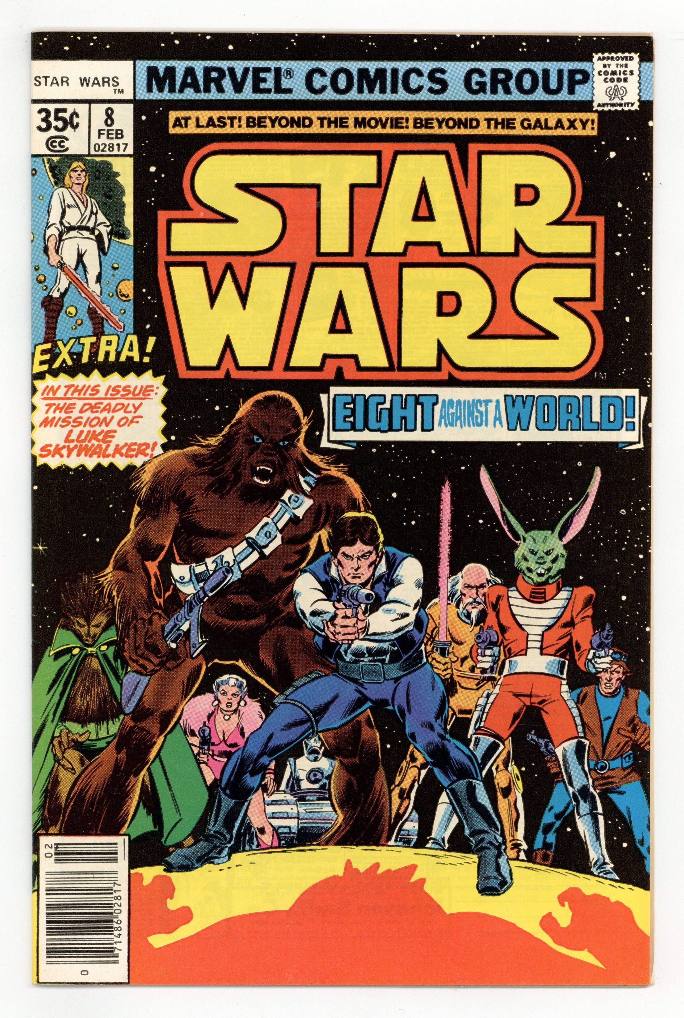 1st printing Newsstand. "Eight for Aduba-3!" Written by Roy Thomas. Art by Howard Chaykin and Tom Palmer. Han Solo and Chewbacca join forces with a motley band of misfits to embark on a dangerous adventure. Meanwhile, Luke Skywalker sets out on a dangerous mission of his own. Cover price $0.35.