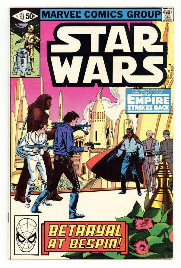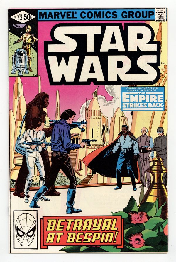 Direct Edition. The Empire Strikes Back: Part 5 of 6. "Betrayal at Bespin!" Based on the screenplay by George Lucas. Adapted by Archie Goodwin. Art by Al Williamson and Carlos Garzon. After their narrow escape from the pursuing Empire Fleet, the crew of the Millennium Falcon sets down on the Cloud City of Bespin for repairs. Lando Calrissian, proprietor of the floating facility, is an old friend of Han's. But he is an old friend with some dark secrets. Meanwhile, Luke's training under the tutelage of the Jedi Master, Yoda, is cut short when the young padawan senses that his friends are in great danger. Against Yoda's better judgement Luke races to Cloud City and the stage is set for the greatest battle between the forces of good and evil. Includes 5 pin-ups by Terry Austin, Michael Golden, John Byrne, Marie Severin, and Frank Miller. Cover price $0.50.