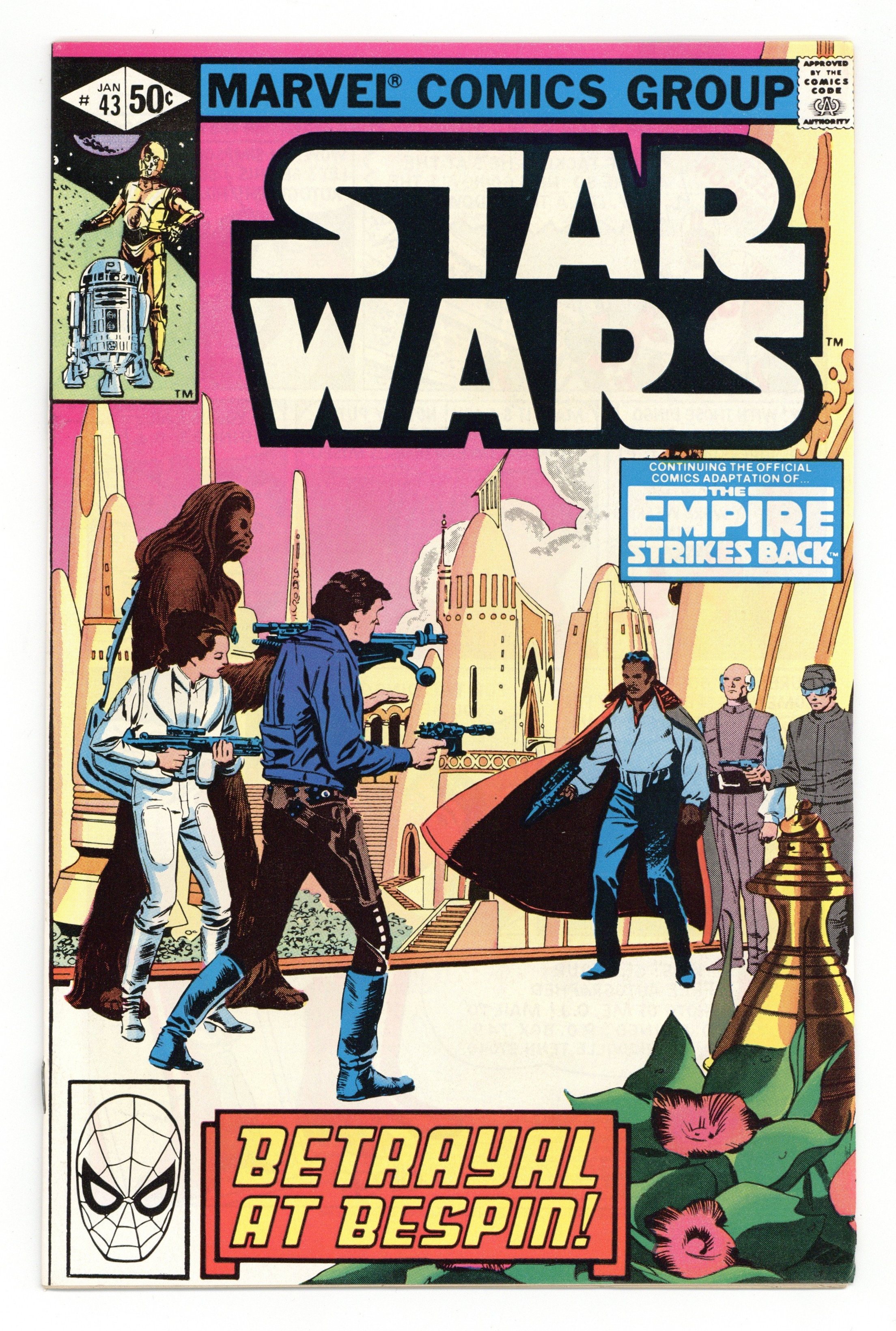 Tags: Star Wars Empire Strikes Back (part 5), Star Wars$18.00Direct Edition. The Empire Strikes Back: Part 5 of 6. "Betrayal at Bespin!" Based on the screenplay by George Lucas. Adapted by Archie Goodwin. Art by Al Williamson and Carlos Garzon. After their narrow escape from the pursuing Empire Fleet, the crew of the Millennium Falcon sets down on the Cloud City of Bespin for repairs. Lando Calrissian, proprietor of the floating facility, is an old friend of Han's. But he is an old friend with some dark secrets. Meanwhile, Luke's training under the tutelage of the Jedi Master, Yoda, is cut short when the young padawan senses that his friends are in great danger. Against Yoda's better judgement Luke races to Cloud City and the stage is set for the greatest battle between the forces of good and evil. Includes 5 pin-ups by Terry Austin, Michael Golden, John Byrne, Marie Severin, and Frank Miller. Cover price $0.50.