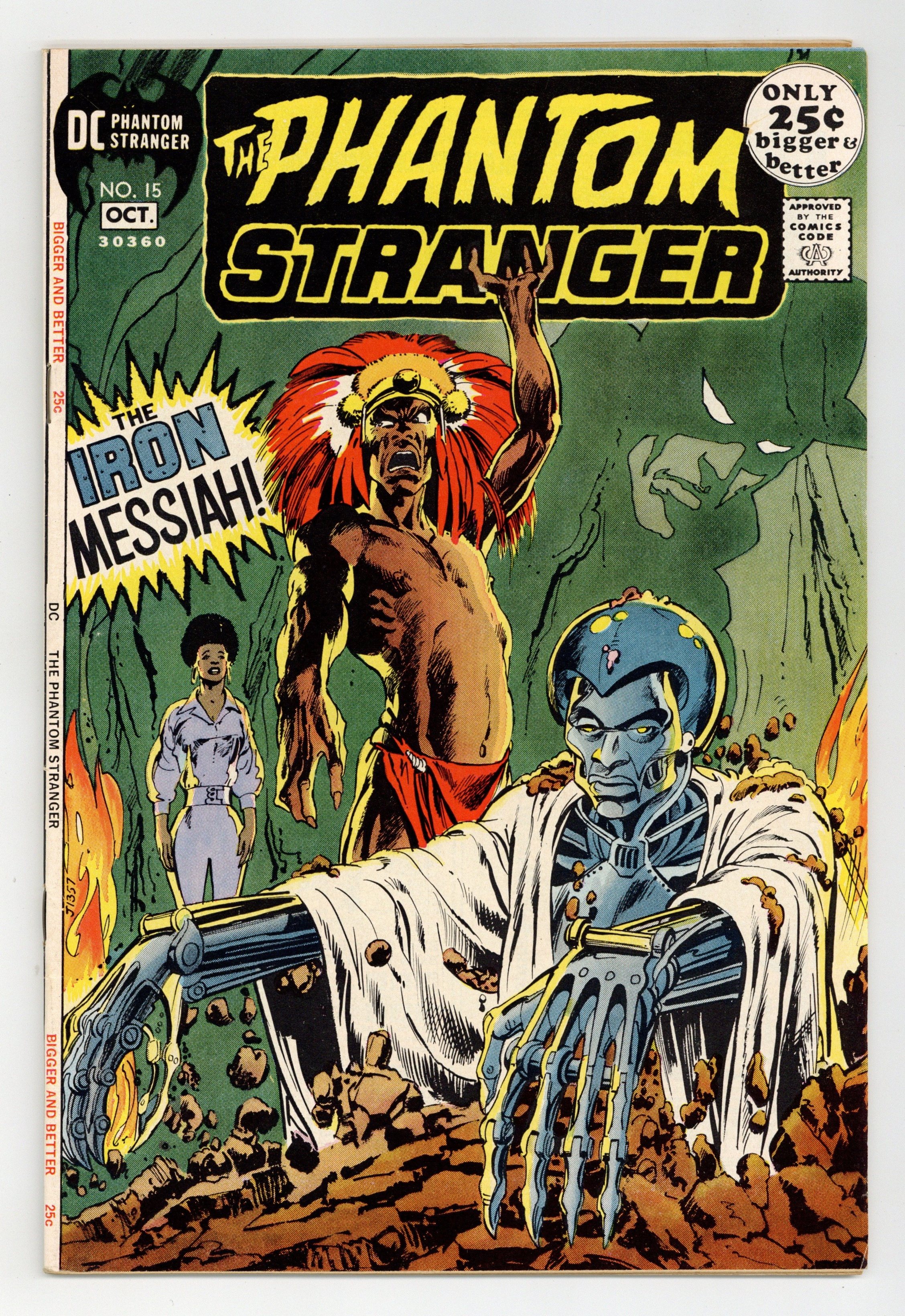 Starts Mar 16 52-page giant. Cover art by Neal Adams. "The Iron Messiah!", script by Len Wein, art by Jim Aparo; John Kweli has returned to Africa to visit his home village, and finds it in conflict with a land developer who is trying to claim the land by any means possible; When diplomacy with the owner of the company doesn't work, John creates the Iron Messiah, a robot based on their tribe's god Chuma, and based on his own personality; Things get complicated when the Iron Messiah develops feelings for John's lover Ororo, however her love is spurned; The Phantom Stranger, who has been watching and helping John whenever there was danger, tries to convince the Iron Messiah to act like a man. "I Battled for the Doom Stone," script by Ed Herron, art by Alex Toth; An explorer discovers that a missing scientist has undergone a fantastic transformation. "Satan's Sextet," script by Robert Kanigher, art by Tony DeZuniga; Dr. Thirteen is asked to stop a group called Satan's Sextet, a musical group that somehow manages to take control of their audiences and make them walk out into the ocean to drown. "I Scout Earth's Strangest Secrets," art by Mort Meskin; Mark Merlin describes three recent cases that he took on in his job as a supernatural investigator. 52 pgs., full color. Cover price $0.25.