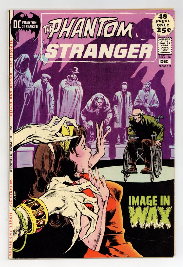 52-page giant. Cover art by Neal Adams. "Image in Wax," script by Len Wein, art by Jim Aparo; A museum of the occult which specializes in wax sculptures of famous practitioners of the occult are after a woman named Dalia; When the Phantom Stranger intervenes he finds that the woman is amnesiac, and so he uses his powers to lift the fog of her memory; He learns that she was an ancient sorceress who was going to be preserved by being made into a wax figure. "The Threat of the Horrible Hex," script by Arnold Drake, art by Mort Meskin; Mark and Elsa travel to central Pennsylvania to help a young woman escape from a curse on her family from the days of the colonial witch trials. "And the Corpse Cried, Murder!", script by Len Wein, art by Tony DeZuniga; Dr. Thirteen is visited by the "ghost" of a Paul Williams, television executive who supposedly committed suicide; The executive asks Thirteen to solve his murder; Which leads him to Ross Curran, who kills himself as well. 52 pgs., full color. Cover price $0.25.