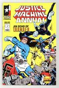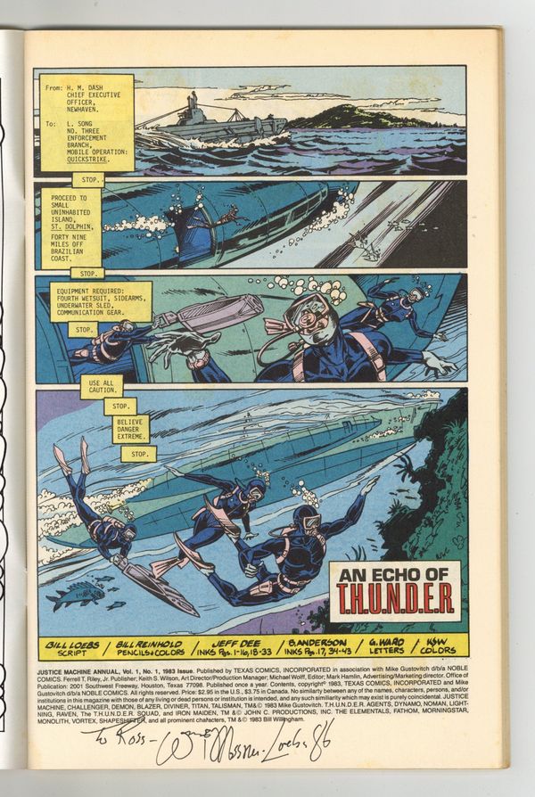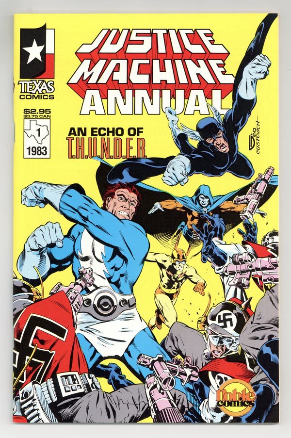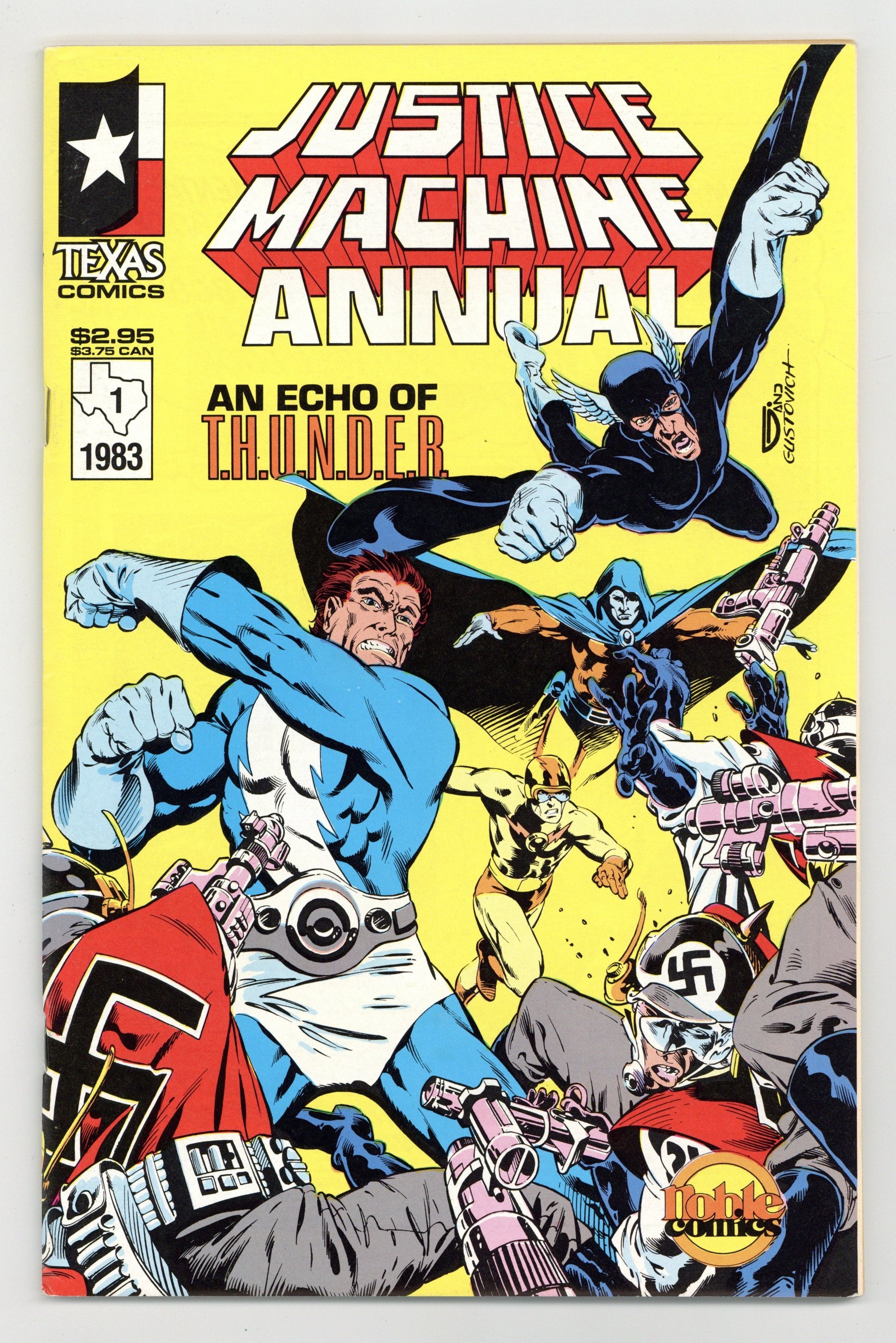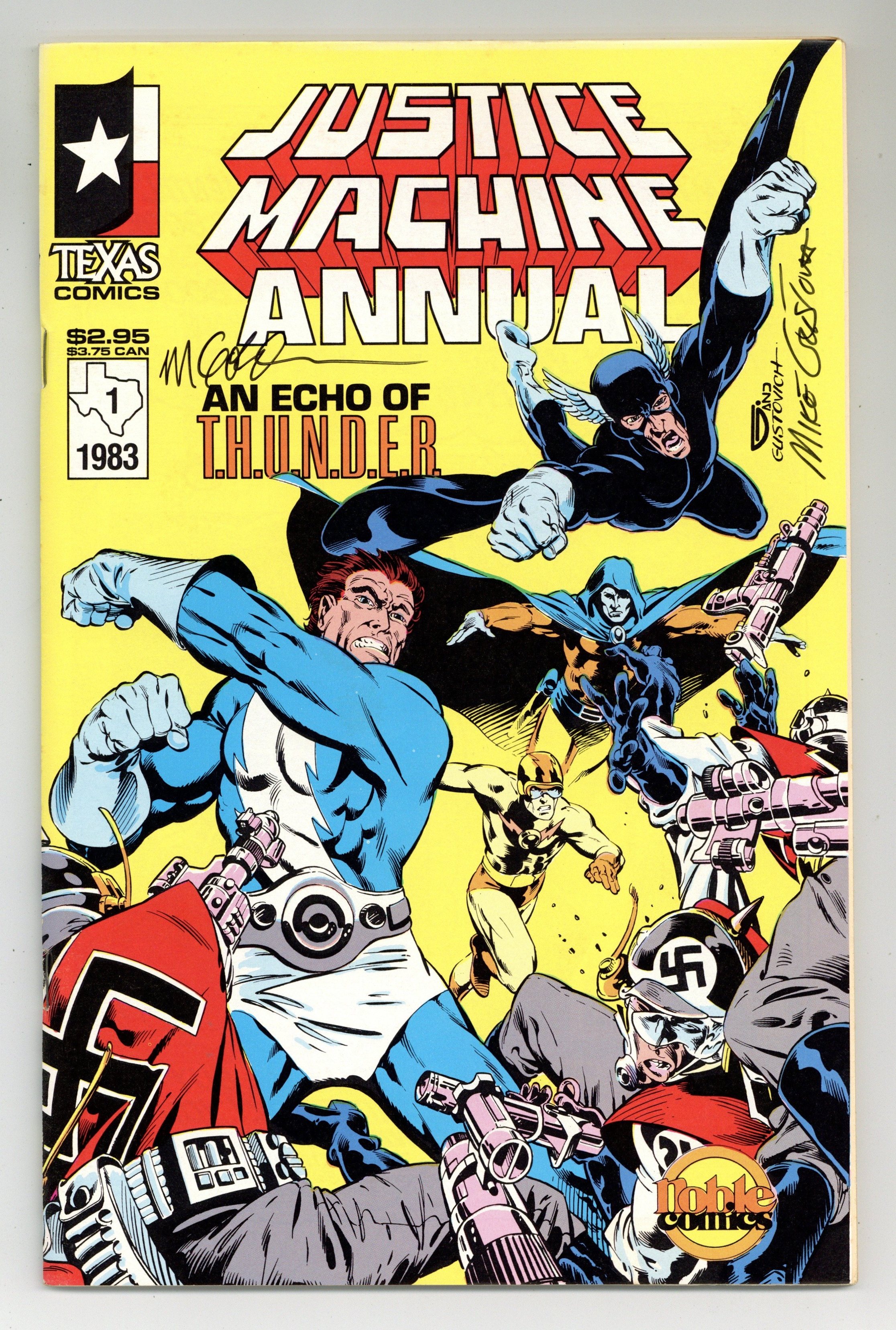 Published 1983 by Texas Comics.$26.00Wrap around cover by Mike Golden and Mike Gustovich. "An Echo of Thunder." 43 pages. Story by Bill Loebs. Pencils by Bill Reinhold. Inks by Jeff Dee and Bill Anderson. How about that, an annual where the title group doesn't even appear on the cover. Fortunately they are inside, where they team up with the Thunder Agents as they endeavor to stop the Nazi Von Geist from using his army of super soldiers to take over the United Nations. This story continues plot elements from the Noble comics Justice Machine series. Sub plots were to be continued in Texas Comics Justice Machine #1. This issue was never published, but the material was eventually published in 1990 as the Justice Machine Summer Spectacular by Innovation. "The shape of things to come." 20 pages. Story and pencils by Bill Willingham. Inks by Bill Anderson. 1st appearance of The Elementals. Shapeshifter is tasked by her employer to find out everything she can about the new group The Elementals. And what better way to determine their abilities than to attack them! 64 pages. Full color. Cover price $2.95.