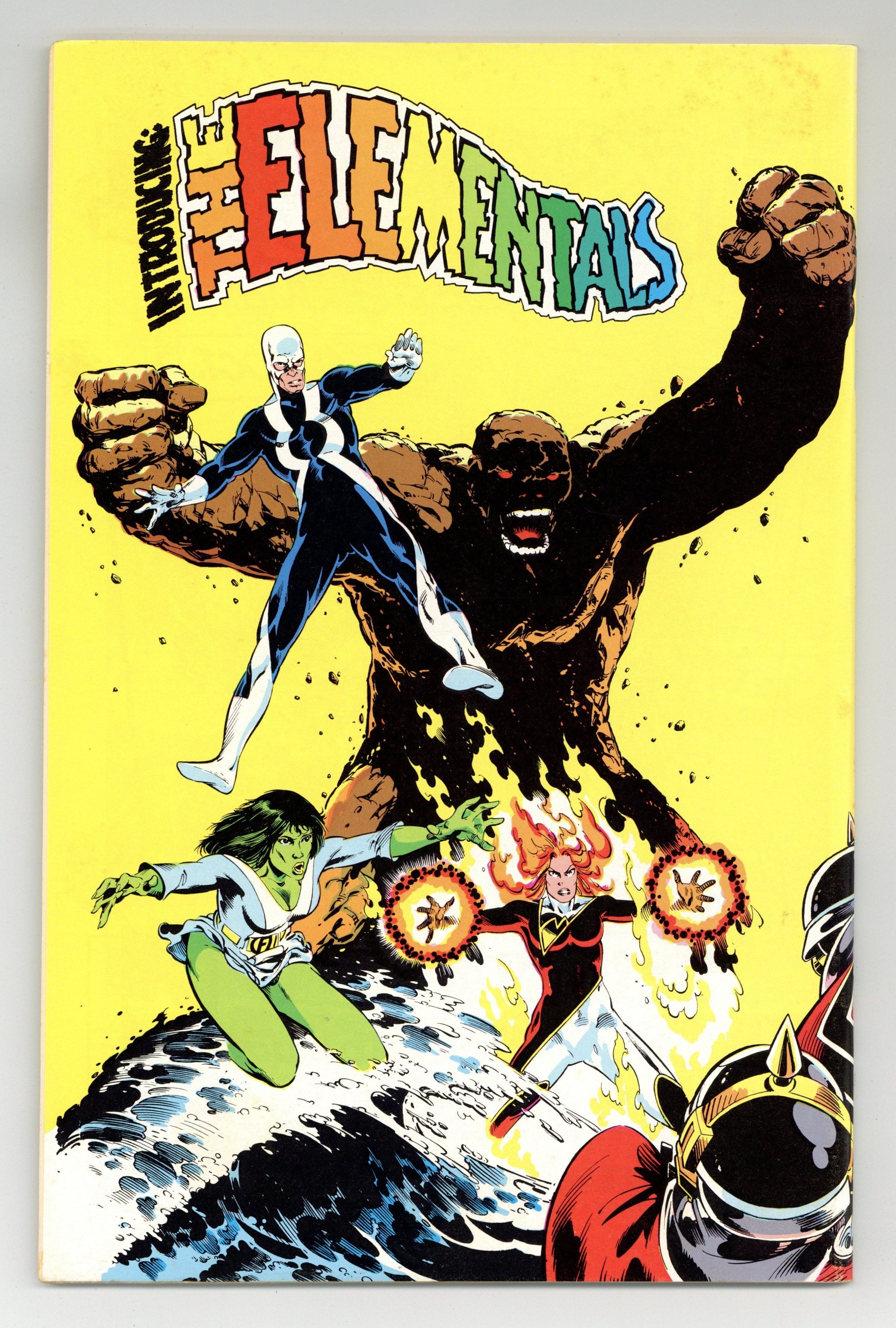 Wrap around cover by Mike Golden and Mike Gustovich. "An Echo of Thunder." 43 pages. Story by Bill Loebs. Pencils by Bill Reinhold. Inks by Jeff Dee and Bill Anderson. How about that, an annual where the title group doesn't even appear on the cover. Fortunately they are inside, where they team up with the Thunder Agents as they endeavor to stop the Nazi Von Geist from using his army of super soldiers to take over the United Nations. This story continues plot elements from the Noble comics Justice Machine series. Sub plots were to be continued in Texas Comics Justice Machine #1. This issue was never published, but the material was eventually published in 1990 as the Justice Machine Summer Spectacular by Innovation. "The shape of things to come." 20 pages. Story and pencils by Bill Willingham. Inks by Bill Anderson. 1st appearance of The Elementals. Shapeshifter is tasked by her employer to find out everything she can about the new group The Elementals. And what better way to determine their abilities than to attack them! 64 pages. Full color. Cover price $2.95.