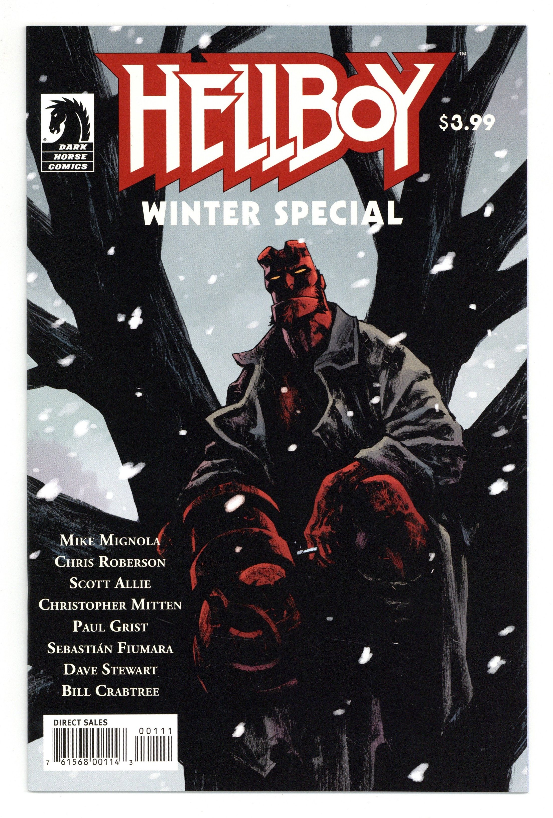 Published Jan 2017 by Dark Horse.$16.00Written by Mike Mignola, Chris Roberson and Scott Allie. Art by Christopher Mitten, Paul Grist and Sebastian Fiumara. Cover by Sebastian Fiumara. Three weird tales show the world of Hellboy through the years, with Edward Grey appearing alongside Sarah Jewell, hero of the recent Rise of the Black Flame series in 1890s London. In 1980s New England, Hellboy, Abe Sapien, and Liz Sherman set out on a simple search for some missing kids and encounter a tormented spirit seeking to share its pain. 32 pages. full color. Cover price $3.99.